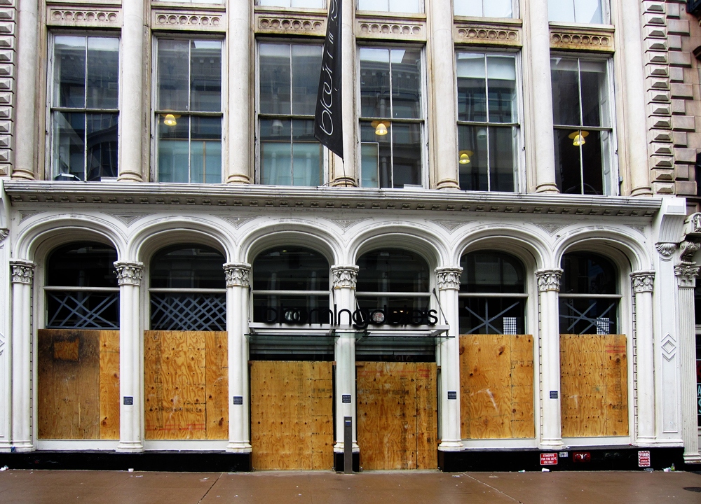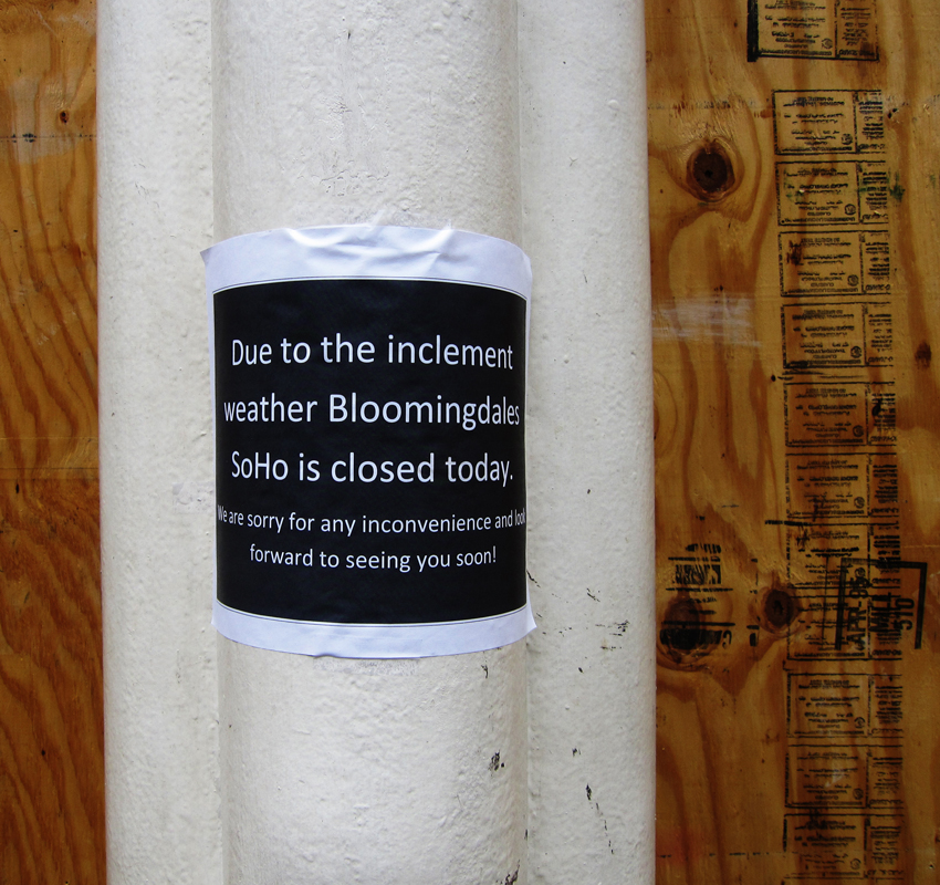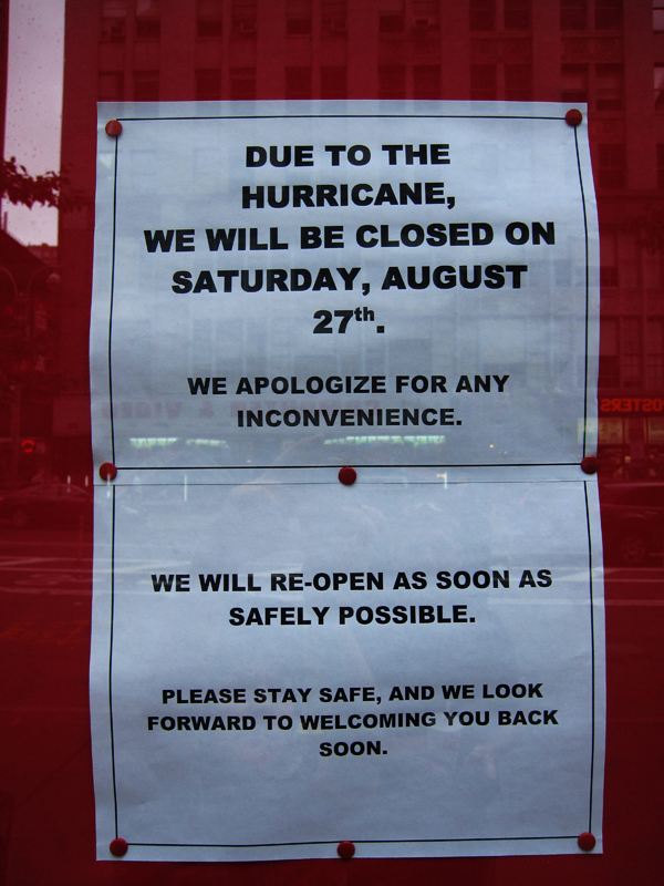 New York City could best be described today as a cross between ‘Omega Man’ and New Year’s Day. It is eerie, empty and enticing. I couldn’t resist going for a ride this morning to soak in the atmosphere and get a sense of a city on notice. Central park was busy as usual with joggers, but that was about all, and the Park’s rangers had all parked their cars in the middle of the road, away from the trees. There were a handful of horse-drawn carriages but none of the usual mass of pedicabs. Riding down Broadway, where all the shows for the weekend have been cancelled, I felt for the tourists. Imagine coming all this way ( if you could actually land – all the airports are currently closed ) and finding your Broadway show cancelled, most of the restaurants closed, no public transport ( first time ever the transit system has been shut down because of weather ), Soho like a ghost town, and the city buttoning down for a hurricane! Nevertheless, there was a feeling of adventure in the air, and when I stopped to take a photo of a theatre sign announcing the closure of the show, a bunch of people lined up behind me to take the same shot. Further downtown, past taped windows and boarded businesses, the sense of being part of an extraordinary event was further enhanced by all the film crews assembling on the tip of Manhattan, waiting for Irene….