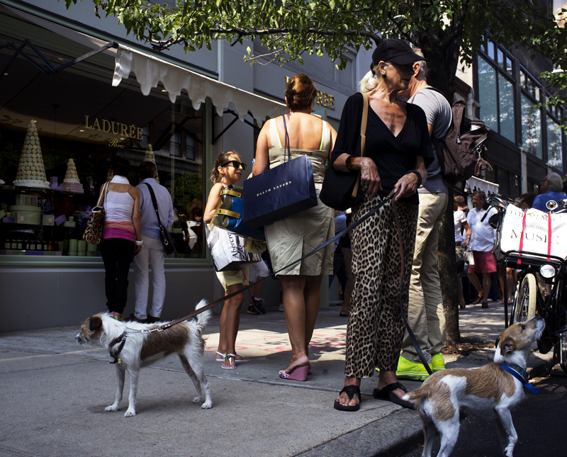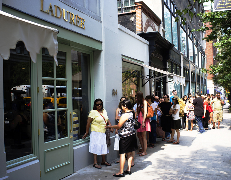 Laduree received a huge welcome to NYC when they recently opened their first US store on Madison Avenue. Macaroons have been quite the rage for some time, and judging by the length of the queue when we cycled past on Saturday, Laduree macaroons must be particularly delicious. There were at least 50 people waiting on the street to join the queue inside, but there were just as many people taking photographs of the queue, or of themselves in front of the shop. So the fun of it took over from the slightly crazy aspect of waiting an hour for a sublime sweet flown in freshly from Paris. Not that we waited – but of course we will go back ( they were sold out of coffee and framboise ) at least to show solidarity with the company mantra that declares ‘a weakness for sweets is a noble approach to everyday living ‘ …..