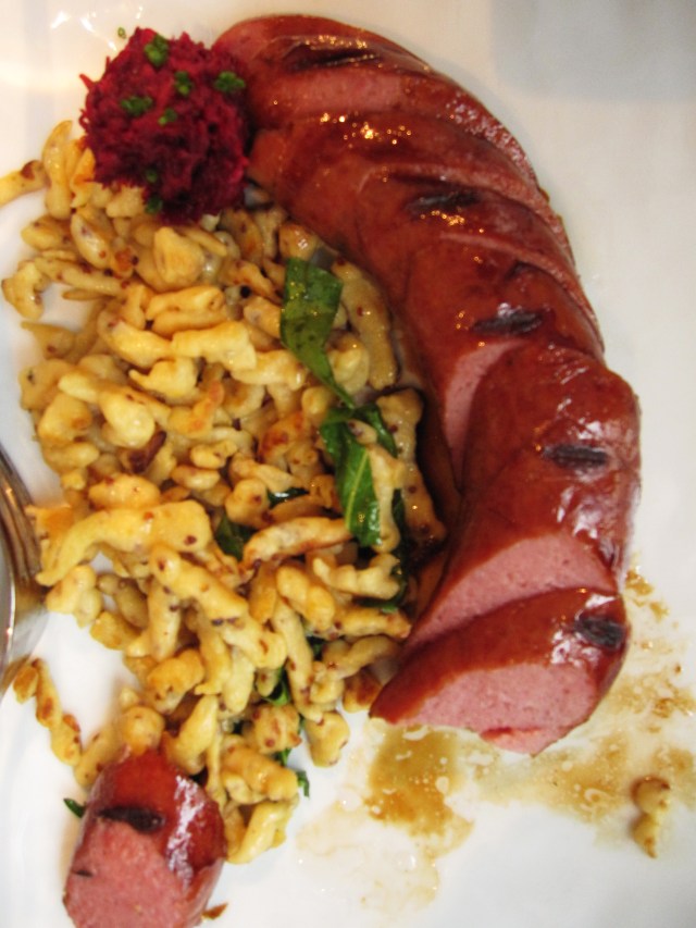 My favourite restaurant lived up to it’s reputation ( and saved mine ) when we celebrated my friend Leanne’s 50th birthday last weekend. Gramercy Tavern has a seasonal earthy menu, with beautifully presented dishes and excellent service. We shared an Heirloom Tomato Salad with Pickled Cherries to begin ( extraordinary combination, but the rich tomato flavour with the slightly soured cherries was superb ) then I had the Summer Flounder with an almond pepper sauce. But the piece de resistance was the Smoked Kiebasa ( made on the premises ) with collard greens, spaetzle and beets. Outstanding! I caught this shot just in time….