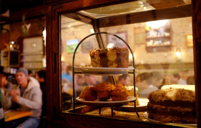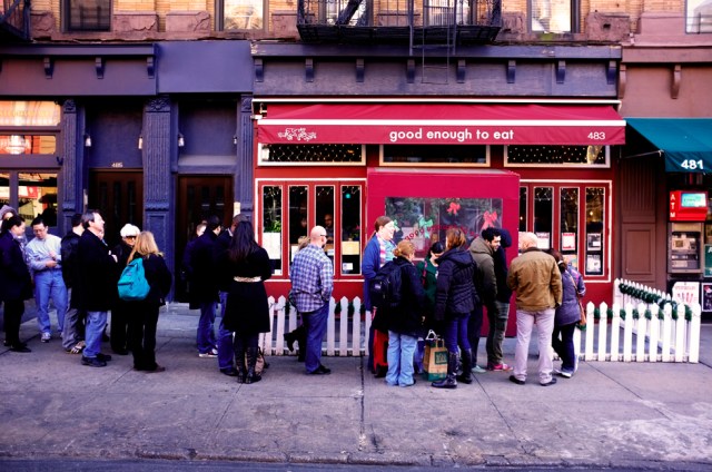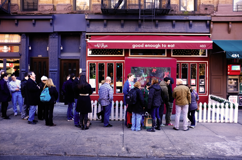 It was like Spring here for the first day of 2012, with absolutely glorious sunshine and blue skies. Riding through Central Park, everyone was out to enjoy the day. Locals and tourists were walking without coats and gloves – even the ducks seemed amazed that they were swimming rather than skating. Had it been typical of this time of the year, we would never have contemplated the late run on brunch and the queue that would normally keep us in the cold for 30 minutes. But today we relaxed in the company of strangers outside ‘Good enough to eat‘ on the upper west side, patiently waiting our turn. In the end we had a choice of the table by the door, or in the hidden alcove behind the cake cabinet. That’s a choice? Of course we took the alcove, which somehow enhanced our experience, viewing the entire restaurant through a landscape of lavishly layered cakes.
