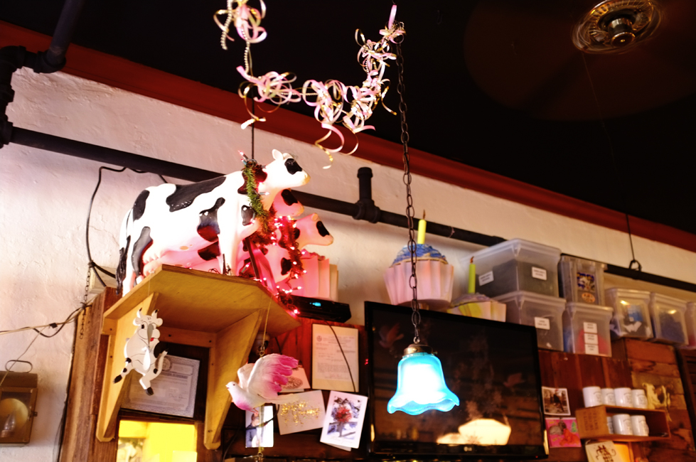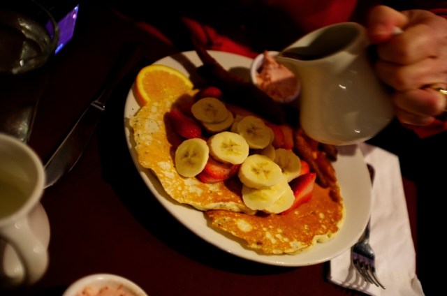 ‘Good Enough to Eat’ is an earthy local eatery on Amsterdam and 83rd known for it’s pancakes and it’s hash. I’ve always been a big fan of comfort food, but this whole place is comfortable – Human League seem to have been playing happily since the place opened in their heyday, the ambiance is casual and warm, and there are cows peering down contentedly from all aspects of the room. On top of that the food is generous in flavour and size, with an unmistakable handmade freshness. I went for the special – lemon poppyseed pancakes topped with strawberries and banana, and served with bacon, maple syrup and strawberry butter. Success! The pancakes were superbly light and the strawberry butter was unusual and delicious. I took a photo before I added the maple syrup – no-one should know how much I like maple syrup on pancakes…