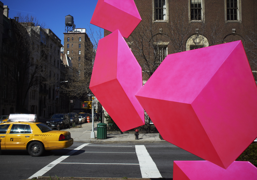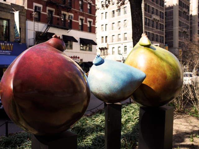 The coming of Spring brings a flush of new sculptures around the city. On Park Avenue Rafael Barrios has created traffic stopping illusions of three dimensional sculptures in brilliant colors. You can hardly believe they are actually flat. But there is no mistaking the expanse of the joyful Woytuk shapes on the west side. One sits just outside Fairways, our supermarket, with the result of a much slimmer shop and much leaner groceries this week….
