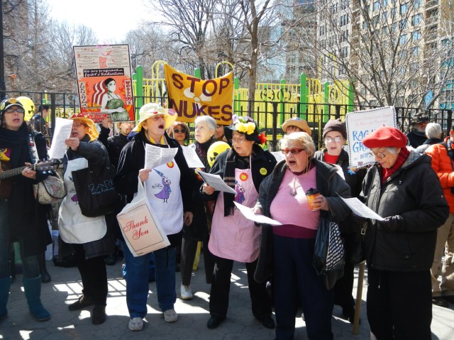 To mark the anniversary of the tsunami in Japan, the Raging Grannies were out in force at Union Square on Sunday. While their appearance was intentionally cliche, there was no mistaking their conviction to the cause. In fact I love their whole philosophy – “(we) see our work as the spreading green branches of a great tree, rising up to provide shelter and nourishment for those who will come after us.”