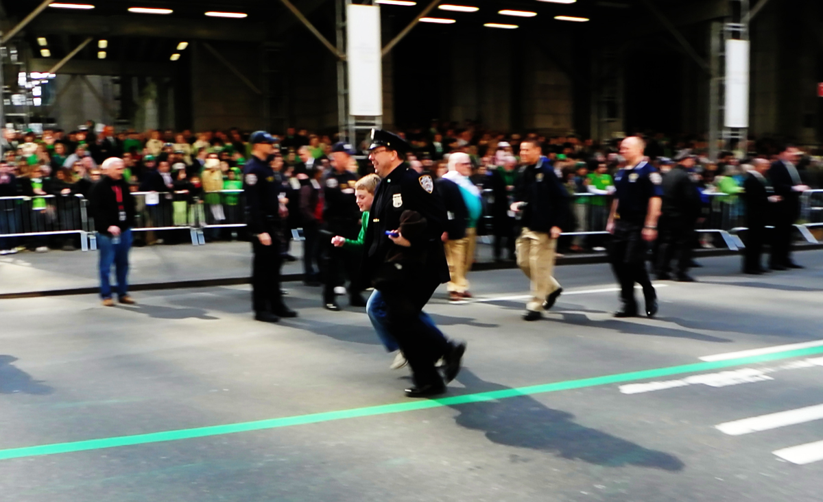 Sean & I were lucky enough to gain access through the parade barricades on 42nd street, where only journalists, the NYPD and secret service people were permitted. This gave us a fantastic opportunity not only to film, but to really feel part of the experience. Imagine being in the middle of an almost deserted Fifth Avenue with a centered green line running all the way uptown, brass bands and bagpipes tuning in behind us, and a few thousand people all wearing green and waving Irish flags… Of course there would be corn beef and cabbage to follow – as has become our tradition at the Lexington Street Armory, but for now there was some marching to do. As always, it was a great day for the Irish!