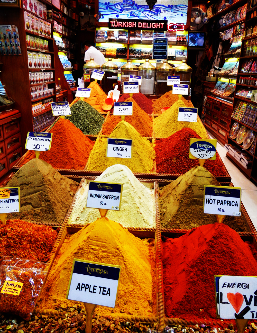 From the top of the Galata Tower you can see for miles. In one direction you can see the clear divide between the European and the Asian sides of the city. In my ignorance, when I first saw a map of the city, I thought the Asian side was a reference to a Chinatown or an ethnically Asian area of the city. But of course the Bosphoros divides 2 continents – or should I say Istanbul unites them – and the energy this inspires is palpable. In the other direction you look towards the Spice Markets, the Grand Bazaar and the distinctive spires of the Blue Mosque. Of all these places I loved the spice markets the best – of course. The colors and smells were fabulous, and the buzzing of the local people around favorite shops and stalls led us to some impractical but essential purchases. Who needs to take a kilo of coffee back to NYC…? But it’s the best in Turkey! And that was just the beginning….