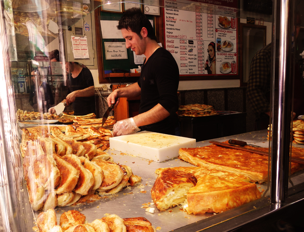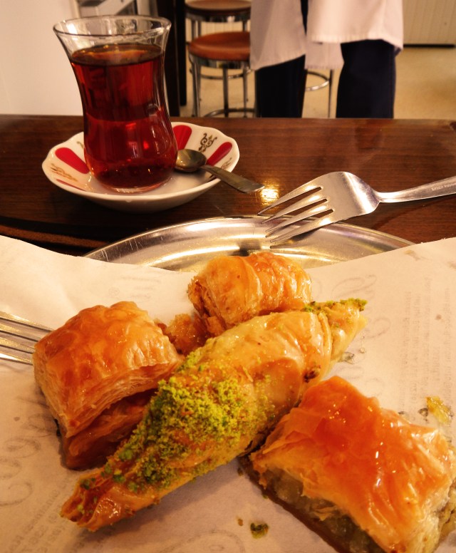 Beyoglu is a bustling area of shops and restaurants, with cobblestone streets winding around the Galata Tower and down to the water. It has tourists, but the narrow streets restrict the size of the hotels and the passage of cars. So it has real character and there are hidden treasures everywhere. One of these was a local eatery I discovered on the first morning. Many of the pastries in the window were new to me – snaking filo rolls, giant sized baked ‘pies’ and flakey squares of cheese and spinach. The baker chopped and plated various portions for me to try – along with the addictive Turkish tea, and by the end of 4 days, I had tried all that the window offered. He sensed my curiosity and with each request, added something new for me to try. His generosity was genuine and as I was soon to realize, very Turkish. There was no alterior motive, he didn’t want anything in return. We didn’t even speak the same language – well, maybe we did. But the generosity of the Turks is astounding, in all my years of traveling I’ve not seen anything like it anywhere.