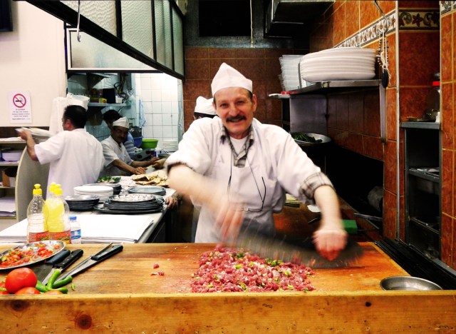 The search for a supremely good diner kebab took us trekking past the Blue Mosque and all around the Grand Bazaar. Both areas were packed with tourists – and restaurants. We were treated to tea and conversation as we stopped along the way, including a lesson on one towering diner grill that was constructed from 80 chickens and would be sold by the end of the day. The security guard at the Grand Bazaar also stopped us when he saw the cameras – but only because he had been involved with the making of the last james Bond film and ‘3-2-1 ACTION!’ had become a favorite english phrase. The diversions and the stories in Istanbul were the best part of the adventure. Carrying cameras and pausing to engage led to many interesting interactions from which the best shots – and stories come. Such was the case when we arrived at Seyhmus Kebab just around the corner from the famous old Turkish Baths. This place was highly recommended and when I indicated this by showing our host my google map with various destinations marked, he immediately showed it to the serious meet chopping man, who’s look transformed to joy. On my map I had marked this restaurant with an asterisk, and another with the words ‘Osman the butcher’. It turned out Osman the butcher was this man’s brother and he took much pride in their both receiving top honors.