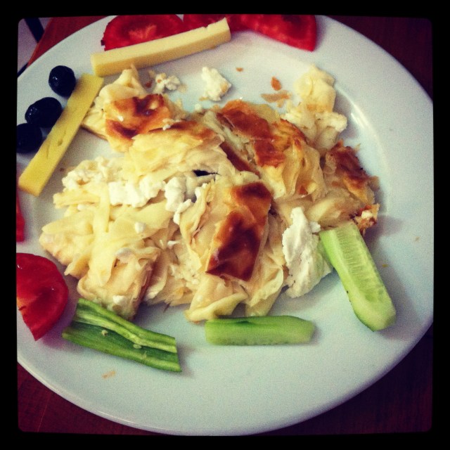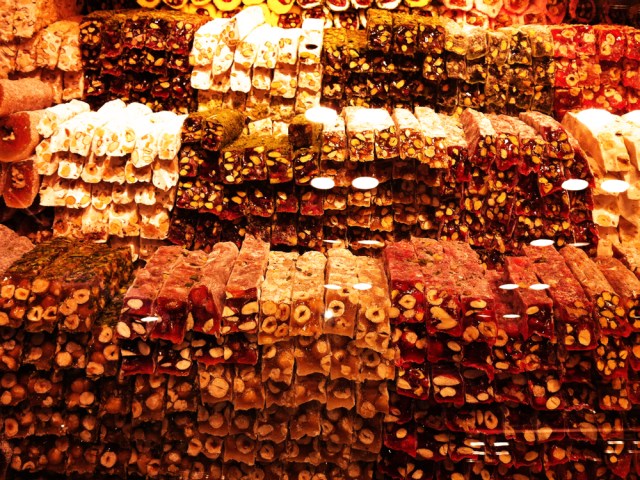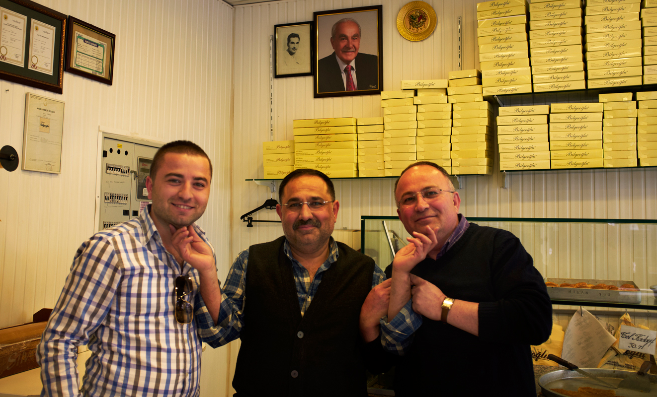 The ferry tide over to Kadikoy was more than just a regular commute. The salty breeze off the ocean, the view back to the Sultan’s palace, and the dolphins playing around the fishing boats in the harbor made for holiday magic. I knew from my well marked map where the markets were, which places were the ‘best’ and where we would probably have lunch. But there was no chance to proceed orderly, so we went from tasting turkish delight to olives to strawberries to cheese to baclava and tea, and then some more baclava. What a feast! In true Turkish fashion a cheeky fellow at the olive shop offered an array of olives for the tasting, demonstrating their sharpness by giving a little kick. There were huge pink ones, pipless green and juicy black, but the highest heels came for the long green ones – all of which he bagged for us. I had earlier bought some small green plums that I was curious to try – everyone seemed to be selling them, even though they looked hard and sour. In fact they were hard and sour, and thinking they must be an acquired taste, I offered the bag to our energetic friend. He laughed and gave a bigger kick as he said ‘no teeth!’ and the gaps told the story. I was stuck with the plums. ( I later found out they are meant to be eaten dipped in salt – which would no doubt inspire a kick of Olympic proportions. ) I had already bought turkish delight from the famous Haci Bekir on the other side, packed in gift boxes as an insurance that we would have some to depart with. I have never been a fan of the jelly option in the Cadbury box, but real turkish delight is firm and flavorsome. In Kadikoy we happened upon a sweet shop just as the need for tea became pressing. Bilgeoglu was a large and immaculate shop with every variation of shredded, layered, twisted and pistachio’d sweet honey pastry you could imagine. Empty boxes were packed to the ceiling in anticipation – it was clear this was a serious, and a very good, sweet shop. We started modestly with tea and a couple of layered squares, but then we were introduced to baclava with kaymac, an intense yogurt sour cream indulgence that would challenge the finest arteries. Whoa. Then came more pastries and entertaining stories about this family business supporting many wives and children. When we told the owner we slept on the European side of Istanbul but came to the Asian side to eat, he immediately produced a tray of delicious pistachio sweets for us to taste and we didn’t look back. We took home a feast of baclava, turkish delight and ground pistachio nuts – and a collection of photos of the three generations of men responsible for all the delightful damage this sweet business has done…. When you go to Istanbul, put Kadikoy and Bilgeoglu high on your list….