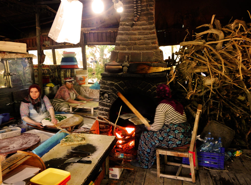 Halfway back to Selcuk there is a small shady place called the Seven Sleepers, where a meandering outside restaurant called Askerin Yeri serves gozleme – thin, thin pancakes with spinach and cheese or other tasty combinations inside. They were delicious, and even moreso after we saw how they were made. Women sitting on cushions with wooden trays over their legs, knead and roll dough to super thin perfection, then fill them, and grill the folded parcels over a very hot fire. The woman in charge of the fire moderates the heat adding wood and then calming the temperature with water squirt bottles. It’s non stop and hot, as orders from the restaurant claim the pancakes as soon as they are flipped from the fire.