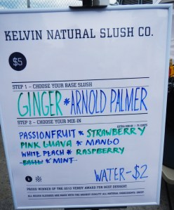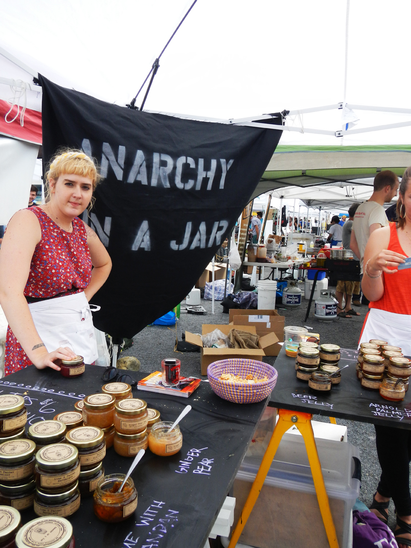 The markets are a snapshot of all the latest food fads, and give the impression that Brooklyn is one big kitchen, catering to meat eaters, vegans, sweet teeth, soy lovers and nostalgics alike. I tasted salted caramel coconut macaroons, intensely delicious ginger syrup from Morris Kitchen, ‘philosopher’s breakfast’ ice-cream ( cinnamon, oat & granola ) and an Arnold Palmer slushie ( the golfer’s favorite – ice tea and citrus ). I marveled at the clever branding of ‘Anarchy in a Jar‘ turning jam into a political statement with aprons & tattoos, where ‘the revolution starts in your mouth’. Then there was the reinvention of shaved ice by ‘People’s Pops’, and the cooking classes of the Kumquat Cupcakery ‘Baking with booze’…