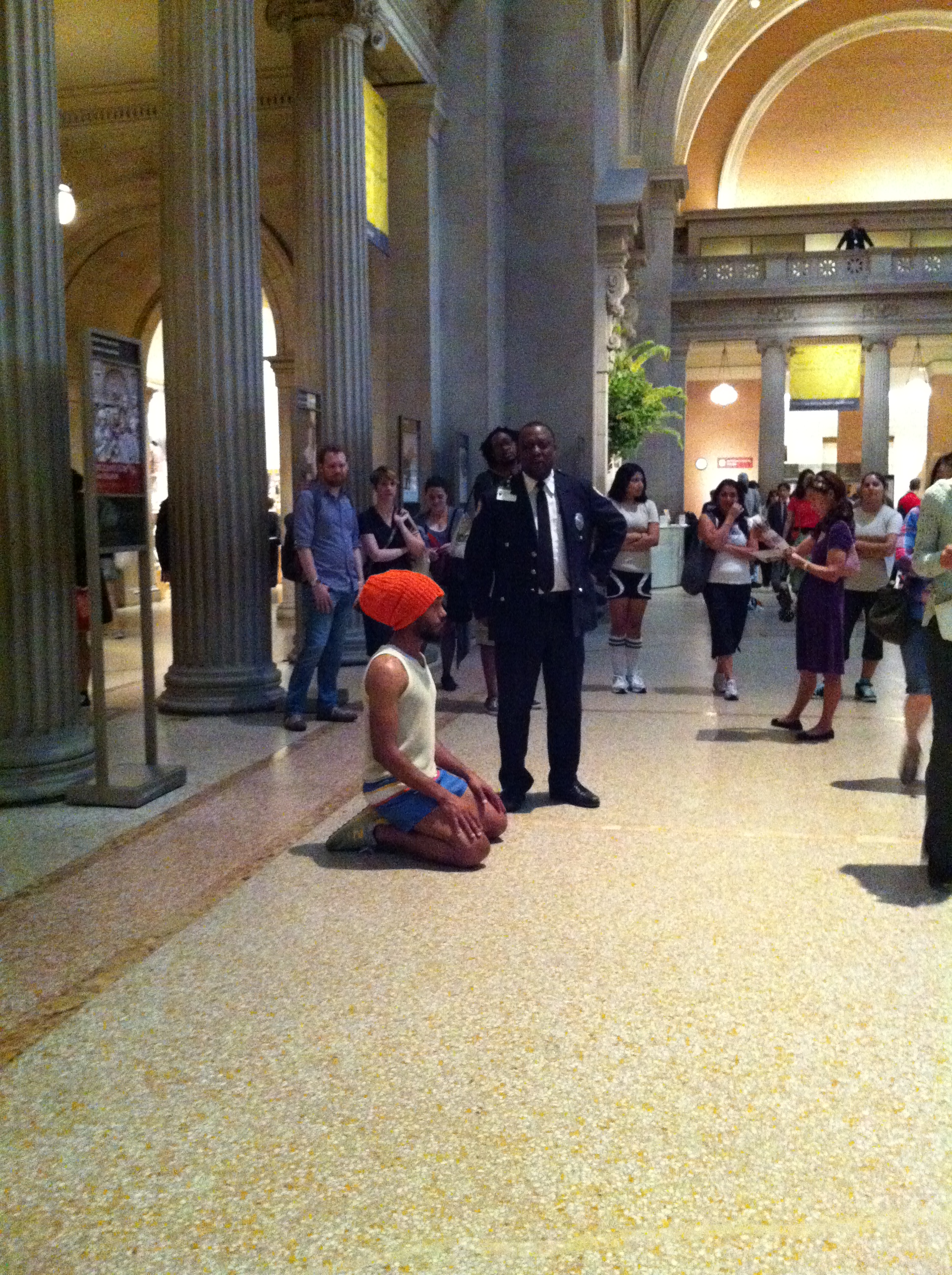 Exiting through the Greek wing was slightly bizarre by contrast, but not nearly as much as stumbling into an art performance between the antiquities. At first it appeared to be a New York 15 minutes of fame event, with a young man making primeval noises and dancing, but it turned out to be an unscheduled performance ‘addressing the literal and metaphoric skeletons in the closet of cultural institutions along 5th avenue’. Security obviously did not appreciate the gesture, removing the meditative fellow to the front halls and then to the door. By the time we followed him out, the rain had stopped and it was a beautiful fresh evening. The jazz band was just warming up….