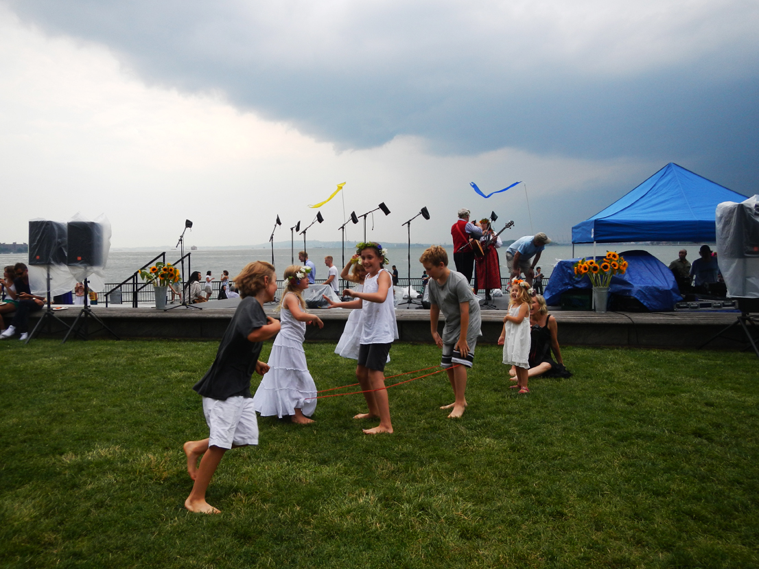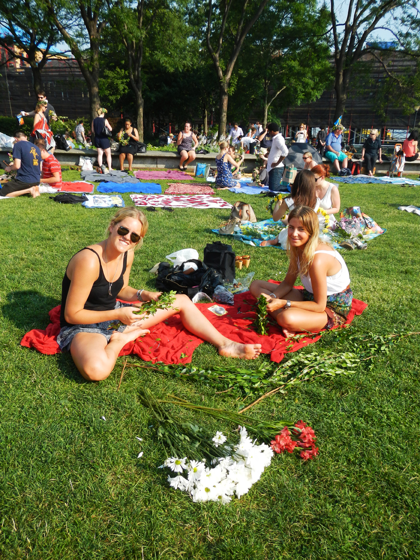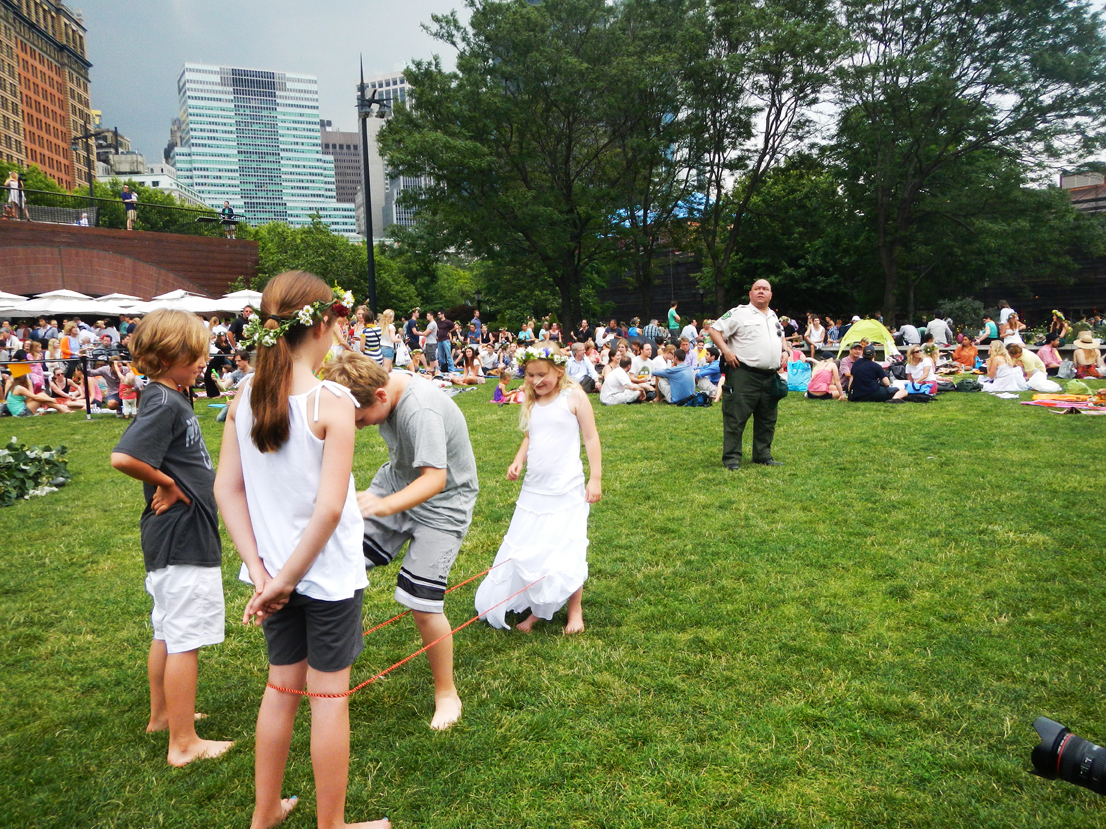 The Swedes take their midsummer celebration seriously. Neither drenching rain or dramatic thunderstorms were enough to dampen the partying that thousands enjoyed during the solstice in Battery Park this week. I have never seen so many blondes and flower garlands in the one place before. Some wore traditional costumes and colors, blue and yellow was in abundance and even a few vikings came out for the day. There was classic food like crepes, and seafood and salty licorice. Even more amazing was the work the Scandi’s invested as part of the tradition, making their garlands by hand, building a colorful maypole and then joining hands to dance in huge concentric circles. Maybe it’s in the genes. After all those long freezing northern winters, the joy of the sun finally coming – and then not setting for days, must be fabulous indeed. No wonder the time is especially magical – one woman said when she was a child she was told to pick 7 wildflowers, put them under her pillow and then dream about her one true love. Her husband glowed, so it must have worked…