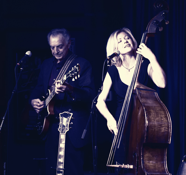Nicki is an Australian bass player and singer who first came to NYC in the nineties to further her studies. She didn’t expect to stay, but as it happened she was in the Iridium Club one night, the original home of famed guitarist Les Paul, and took up his invitation to perform a number on stage with a couple of male friends. At the end of the song Les said the guys could go, ‘but leave the girl up here’. Twelve years later, she’s still there! Monday nights at the Iridium became a regular gig for Nicki, and it was here she also added vocals to her repertoire. Les Paul has since passed, but the Trio continues to set the standard with a formidable lineup of guests and last night this just happened to be Bucky Pizzarelli and Gene Bertoncini. The two men appeared quite frail and had to be helped on stage – Gene is 75, and Bucky is 94, with gnarled arthritic hands. They bent over their guitars, silver hair glistening against the neon background, but as they started to play, the physical turned to the ethereal. It was magic to hear them play. It turned out Bucky had flown in from Paraguay in time for the gig, and was about to go on the road with Nicki for the following week. He also just recorded an album with Paul McCartney – the Beatle flew him over to London – and being 94 was no more a deterrent to playing than was arthritis. I asked Nicki about how she felt performing with these master musicians, veterans of the industry. At first she quoted Les Paul likening it to a condemned building having a new flagpole. But she said her classical training and appreciation of the craft of jazz meant they had a special respect for her. On stage it was all like an extended family, with a comraderie that you could sense.