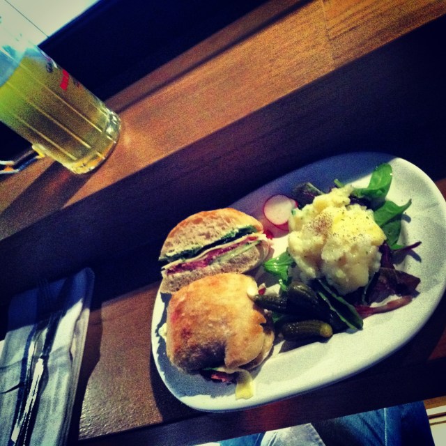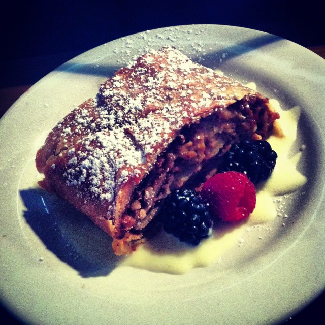 We found Landbrot by accident last weekend. Actually it was no accident. Sean & I were on the prowl for a good coffee, and the hunger pangs from a brisk Autumn afternoon bike ride drew us directly to the yeasty smells of bakery and beer. As we walked in a waiter was serving a black forest ham & emmental ciabatta sandwich with potato salad – which we ordered without further ado. It was delicious, but if I’d paused, we may have ordered the Flaming Pie instead. It’s not what the name suggests (I visualized a German bombe alaska), instead it’s a crispy thin crust with creme fraiche, bacon and onion. Next time. Unless it’s raining, then the Farmers Bratwurst with sauerkraut & German mustard will do the trick. Of course a tapped wheat beer was the perfect accompaniment, as was coffee with Sean’s apple strudel. The menu said the phyllo pastry for the strudel was hand rolled. This seemed a stretch in an inexpensive casual cafe in the Village. But not so, the dessert was finely made to perfection, a tribute to German culinary engineering…
