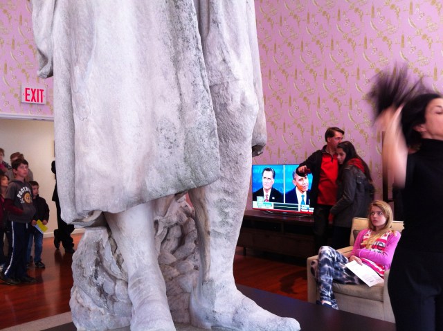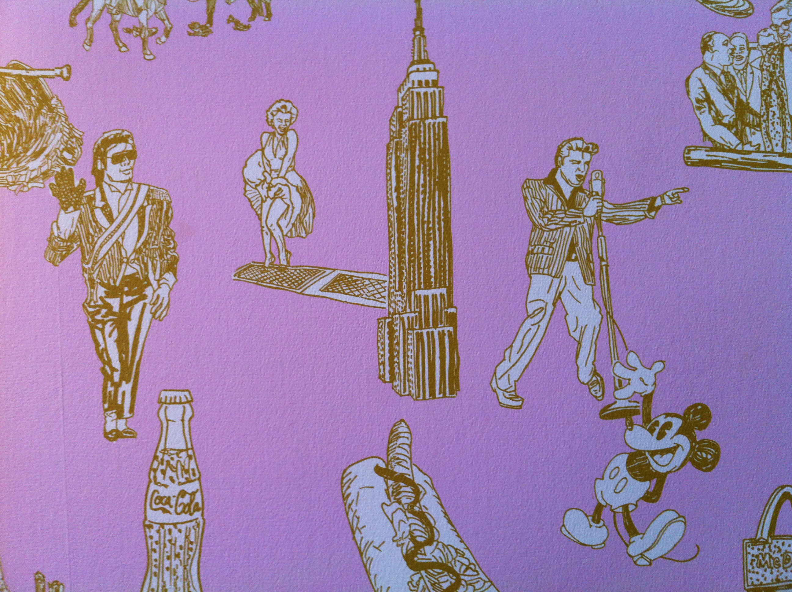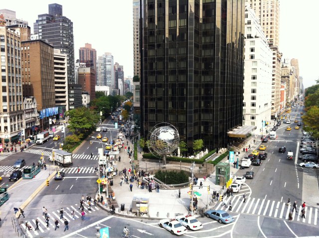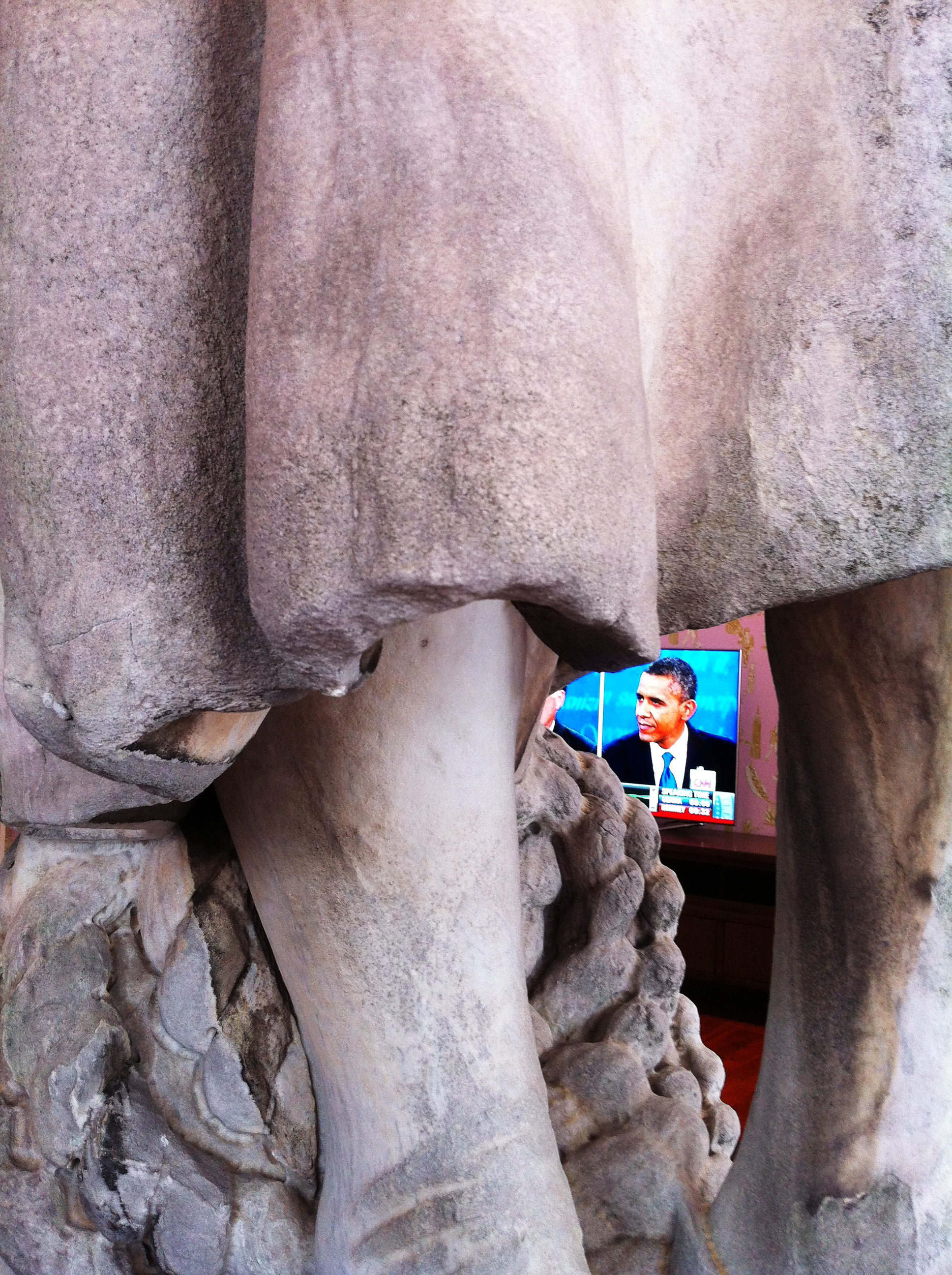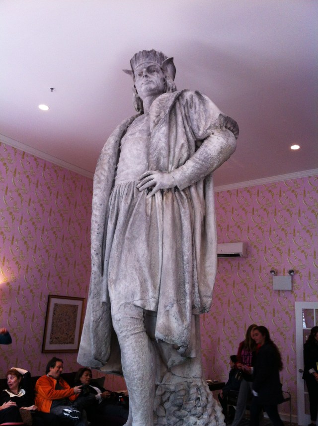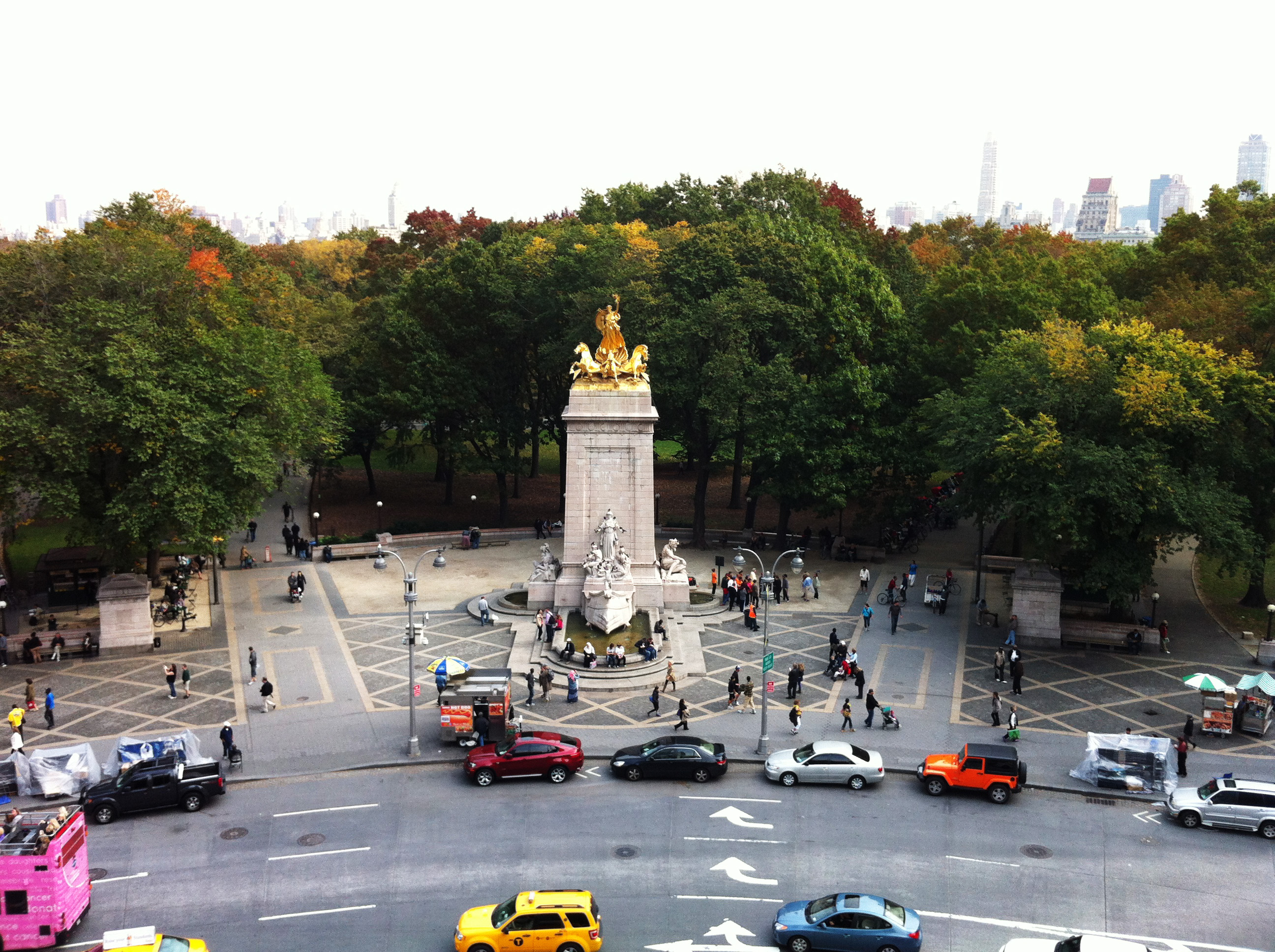 I finally discovered Columbus this week and it was an excellent adventure! The statue of Christopher Columbus has been standing in the middle of Columbus Circle for 120 years and thanks to the Public Art Fund ( directed and curated by Australian Nicholas Baume ) you can currently meet with the explorer face to face. Actually face to foot. A furnished living room has been constructed around the statue seventy feet off the ground, and this provides a quirky mood to an otherwise very serious marble man. Elvis and Mickey Mouse adorn the pink wallpaper, there are couches and bookshelves, a copy of today’s paper, and a flat-screen television beaming the latest news. Columbus clearly keeps up with the country he found ( and may have given us his preference for the election outcome ), and has one of the best views in the city.