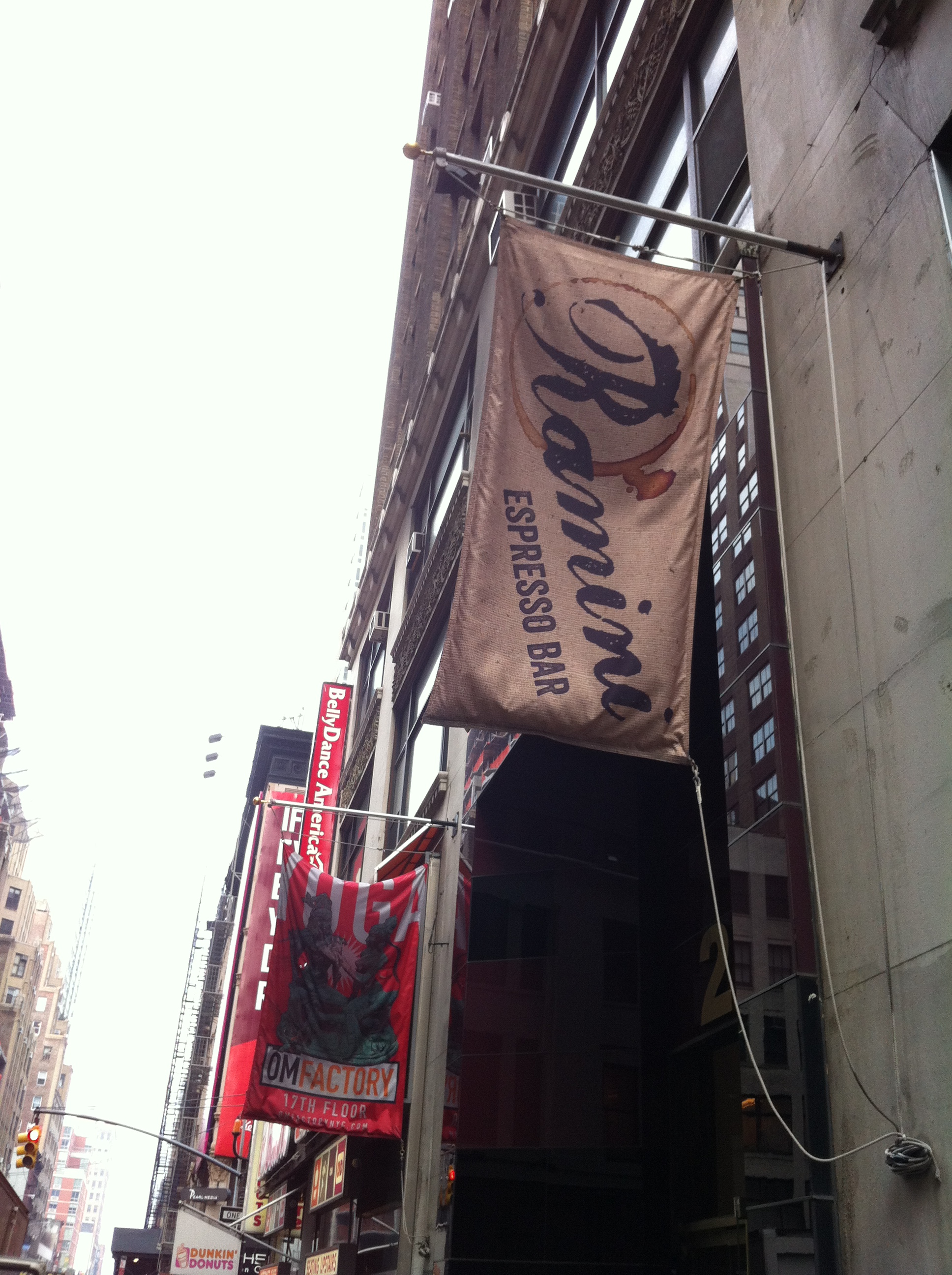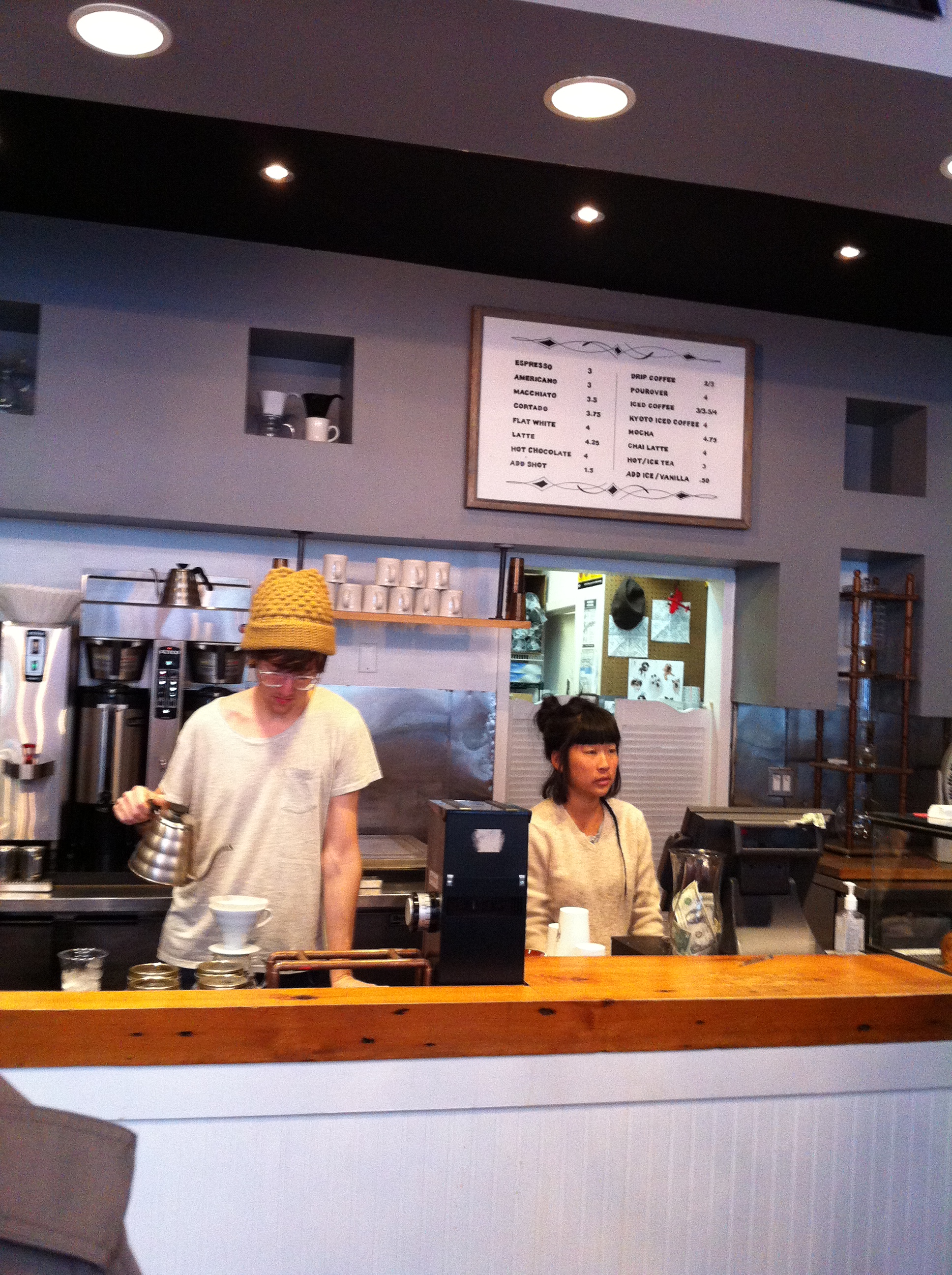 Culture Express on West 38th was first on the hit list. From the outside it looked ‘Brooklyn’ enough – the barista was wearing a geeky hat typical of his trade, trending with a code of coolness that I haven’t quite deciphered yet. But inside there was deafening head banging music, and the flat whites were so strong and bitter that Sean likened the whole experience to water boarding. And that was before he tasted the blood orange donut.