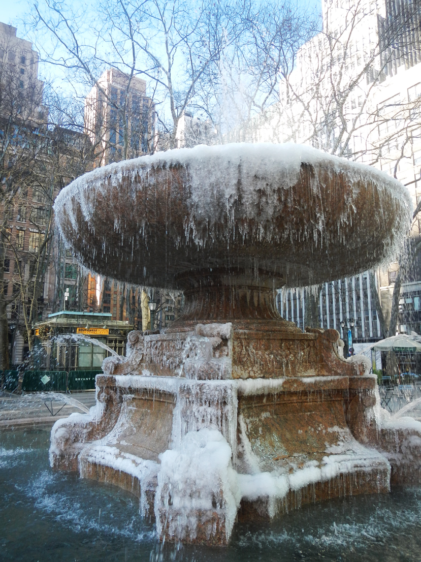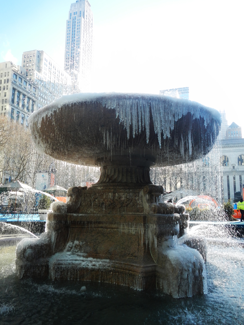 Winter has created a work of art in the Bryant Park fountain on the corner of 42nd and 6th Avenue. A week ago the fountain was frozen solid, but yesterday it had melted just enough to catch the light with both ice and water glistening in the sunshine. Spectacular!