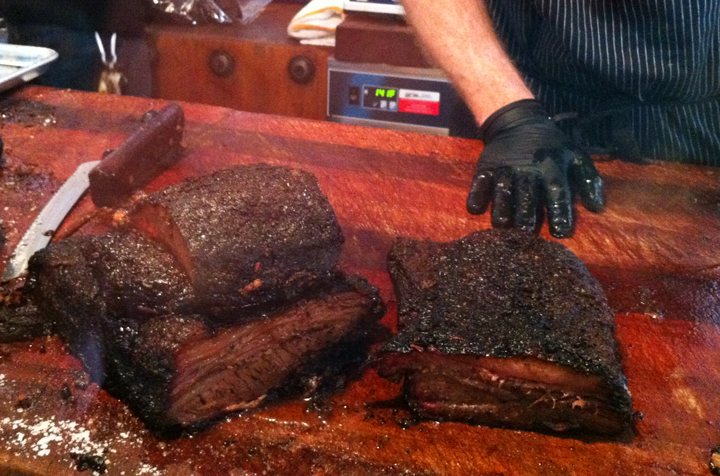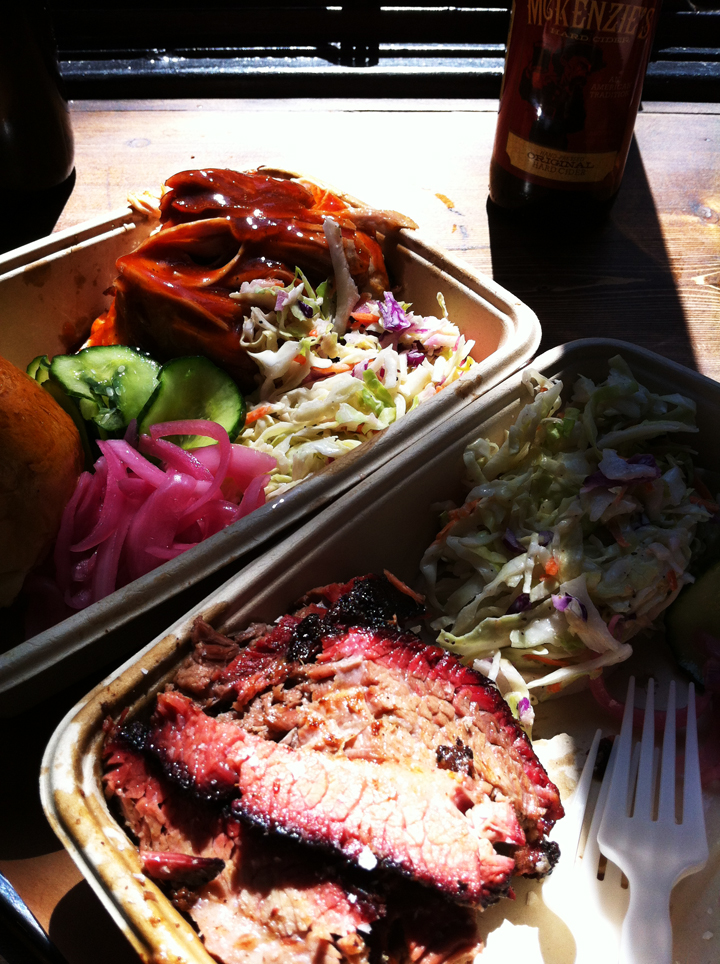 The pit master is Hugh Mangum who created a huge following at the open air markets in Williamsburg over the past summer. His trick is in the rub, but also the slow cooking process which gives the meat that ‘melt in the mouth’ sensation. Unbelievably delicious sweet meat. The smoker runs 24 hours a day and is fueled totally by wood, no gas. Hugh was there stoking the coals when we paused to consider the brisket, the brontosaurus or the rack…? But it’s the brisket that is the signature choice. He told us about the cooking process, about the pink rings created in the meat as it slowly breathes in the smoke. Sounds ominous, but all this is years of developing a ‘Texalina’ taste that fuses the best Texas tradition with Carolina methodology. Hugh said they have many Australian regulars so I’m not the only Aussie on the hunt. Now that Rosella have gone out of business we may have to change our old barbecue model…