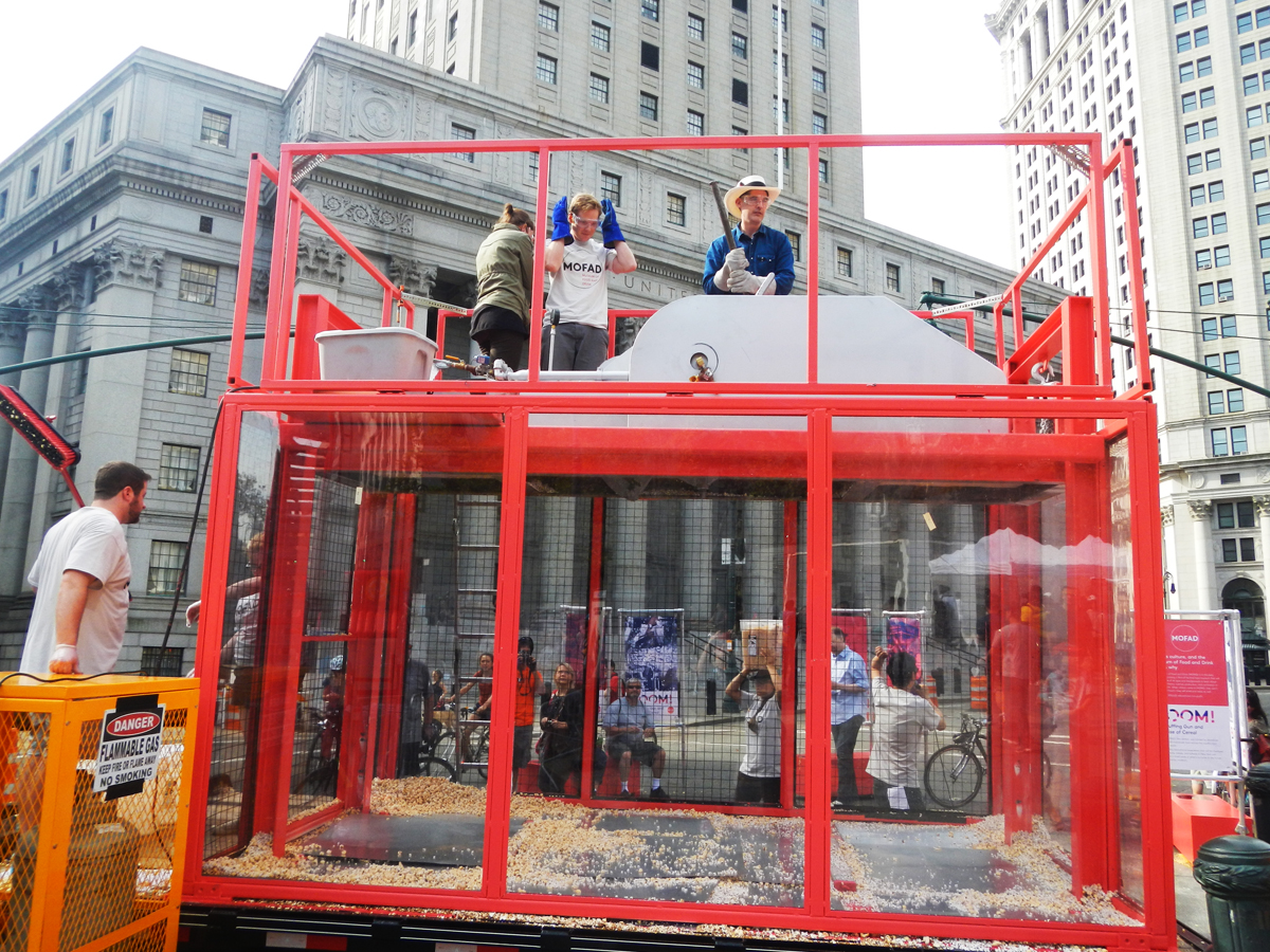 There was a circus atmosphere in front of City hall as muscle-men challenged the crowd to ripple massive ropes under the stop watch, people traded their wheels for the whizz of a ride on the flying fox, and a giant popping machine introduced the coming of a most welcome Museum for Food and Drink. The popper had everyone transfixed. Corn was poured into a compression container on the roof of the truck and as the pressure – and anticipation – grew to boiling point, a well armed fellow whacked the release of the corn which exploded into puffed perfection. Then it was all swept aside for tasting.