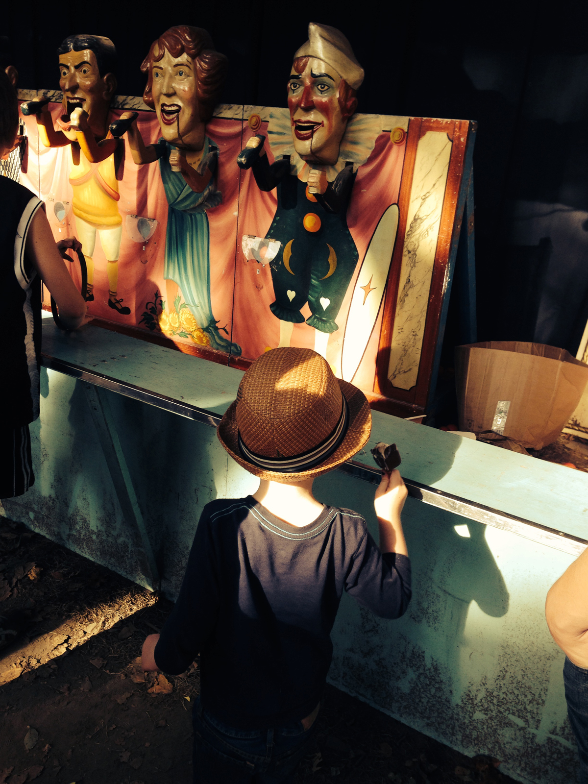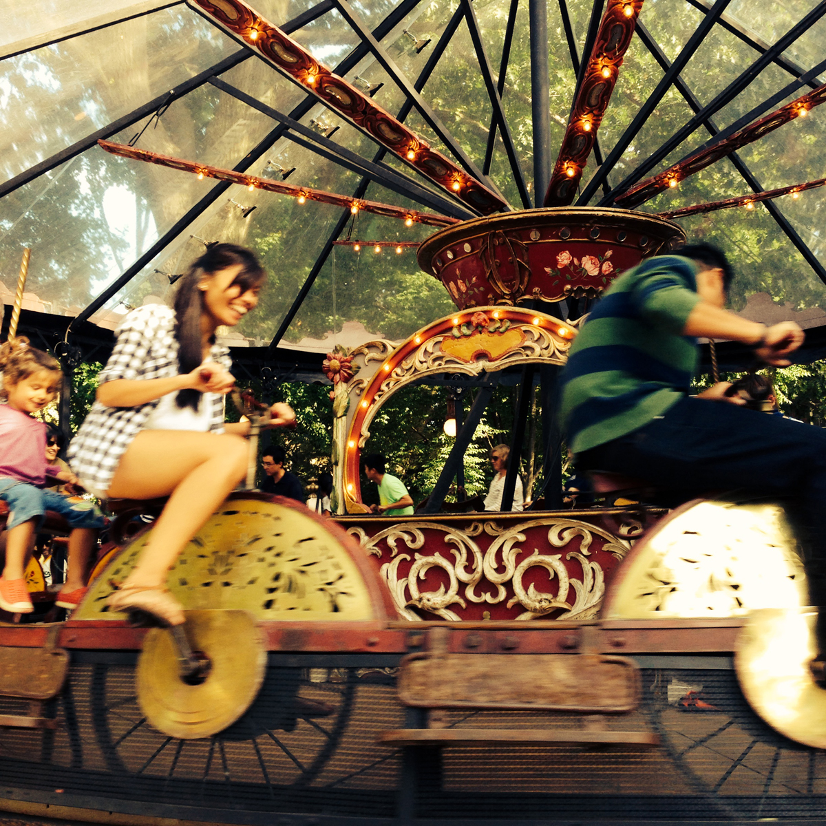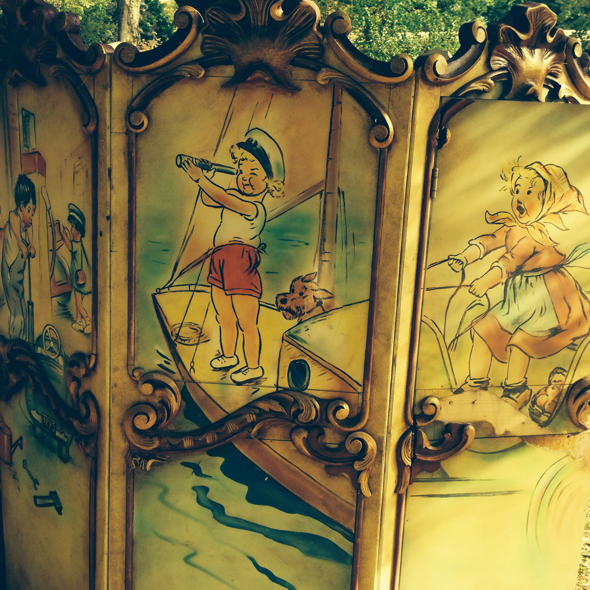 My absolute favorite was the Velocipedes that was built at a time when bicycles were just becoming popular. The mechanism was created by a contemporary of Edison that rumbled along at great pace when everyone pedaled at the same time. Just at that moment when you thought their collective speed would send the golden bicycles off their tracks, the whole thing started to move backwards causing shrieks of delight from the riders. These were adult shrieks. The child-like ones came from everywhere else as regal carriages, oversized swans, alligators and of course giant pigs flew them through the air. It was an exciting day, and no matter how giddying or exhausting, every last coupon had to be spent.