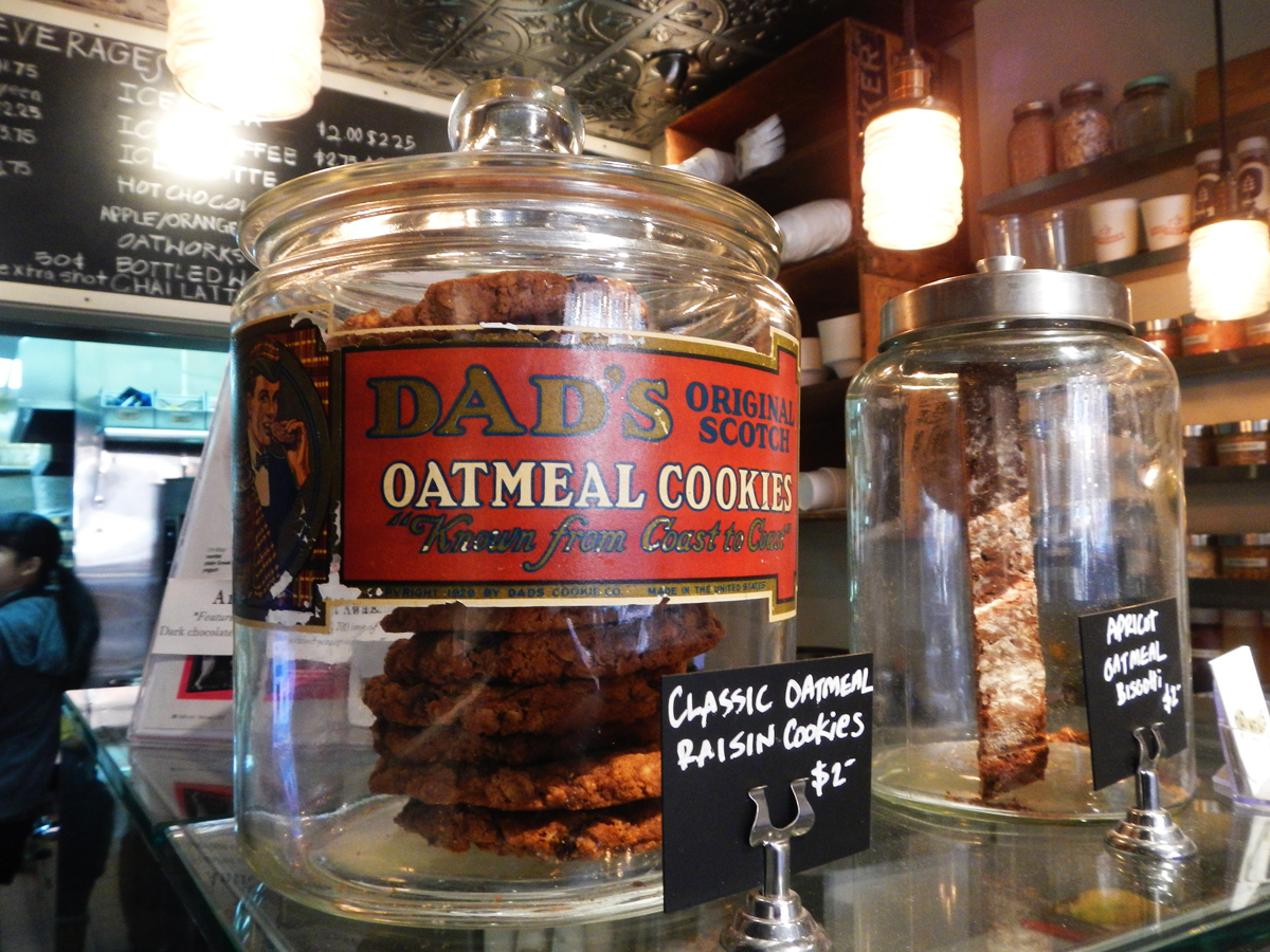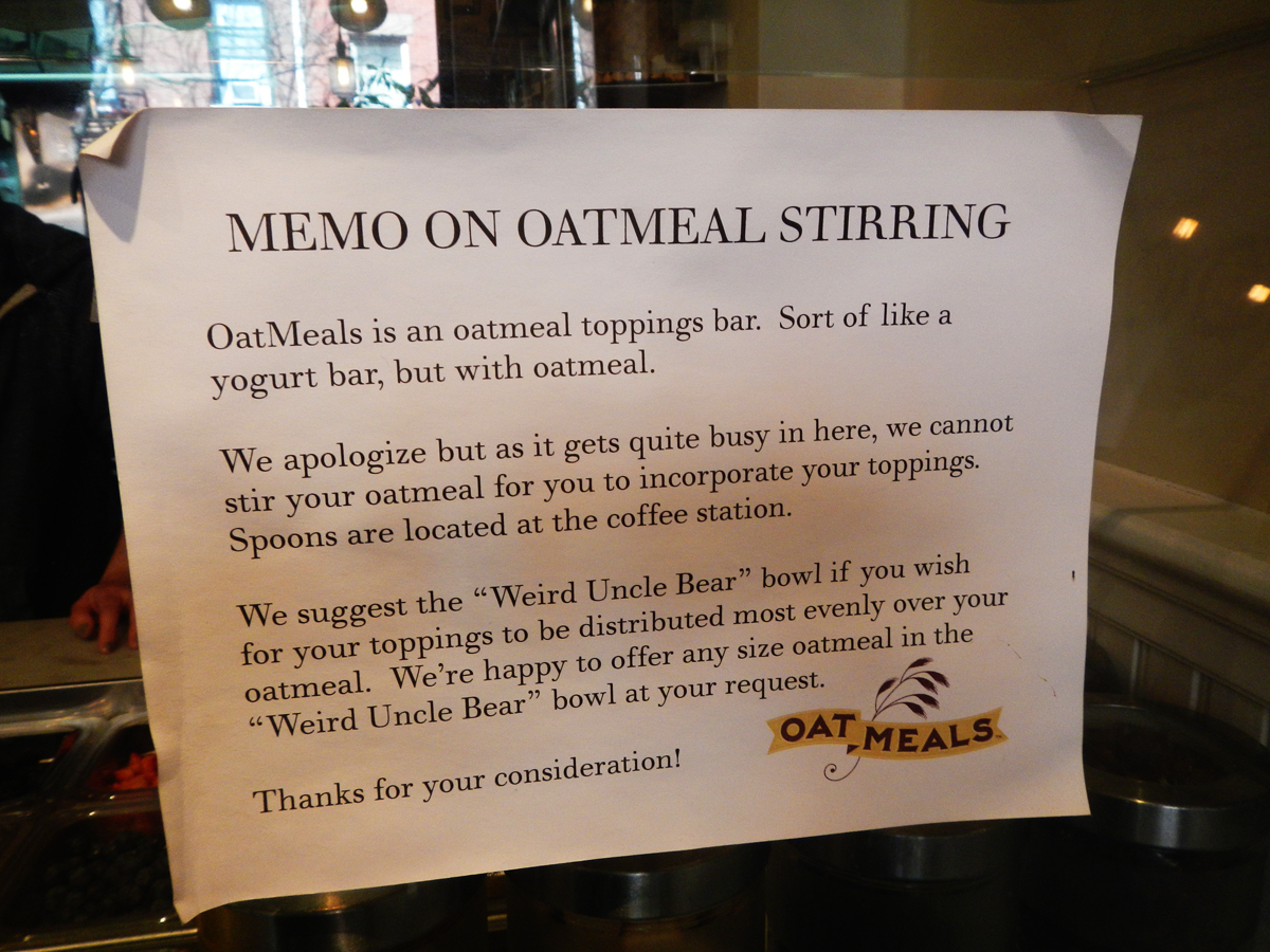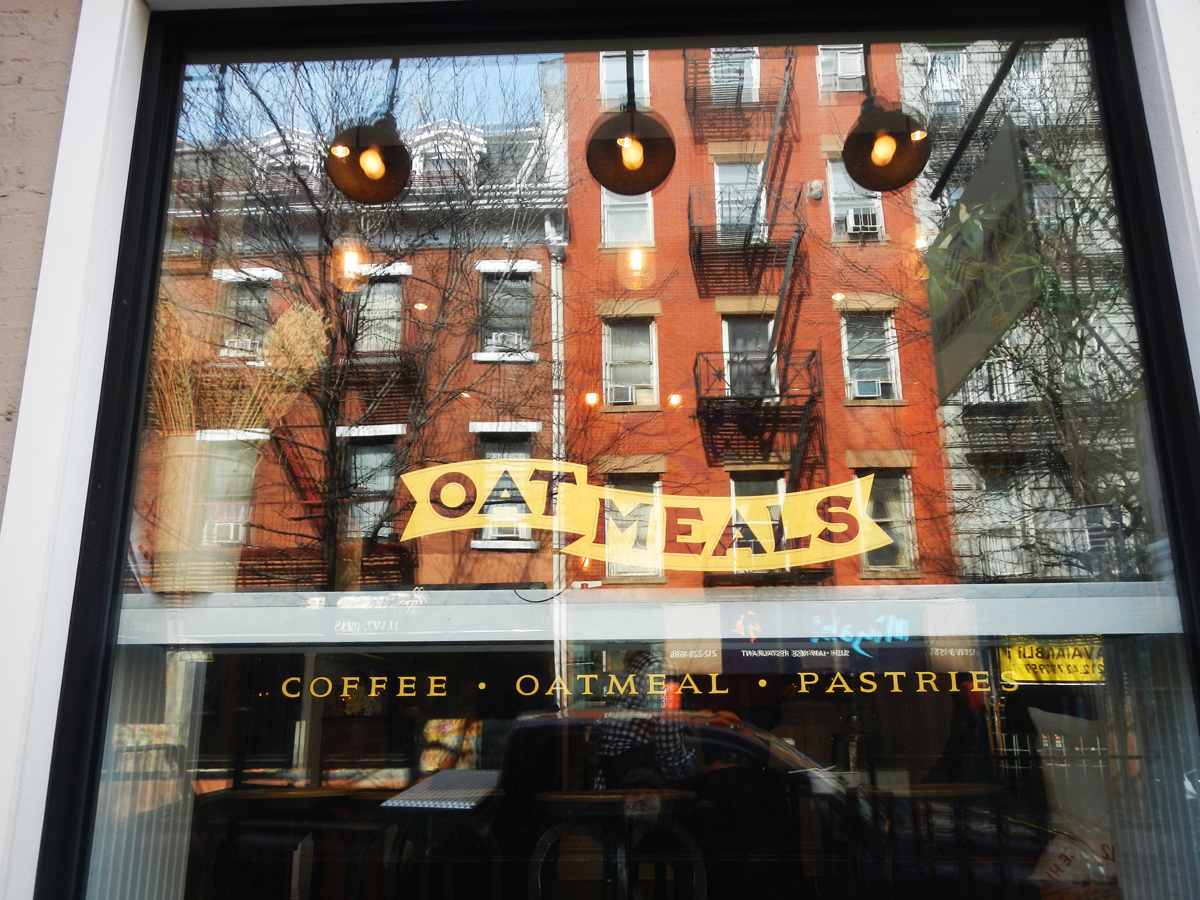 A dalliance with dietary diversity has seen the best of us dance between the desirable and the dubious. As I was riding in search of the former – the seasonal and somewhat elusive hot cross bun – I encountered the latter in a cheerful little shop called Oatmeals over the road from The Blue Note in Greenwich Village. NYC has a number of very successful one-item outlets, including the rice pudding shop in Spring Street and the rice crispy treat house on the Upper West Side. No doubt the toast craze from the west coast will be next. But for now oats have gone wild.