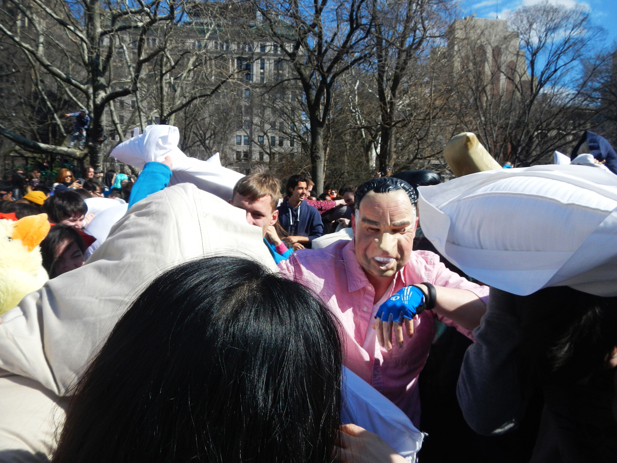 World diplomacy took a feathery but firm direction last weekend with the celebration of International Pillow Fight Day in Washington Square. Students from nearby NYU took a modern movement to a mosh pit of mirth. Comfy cushions were swung and sploofed with enthusiastic delight as pillows flew high in the air creating a snowstorm of fluff. Get the corporate sponsor brought a deluge of down on Dacron while droning surveillance from overhead captured all the action.