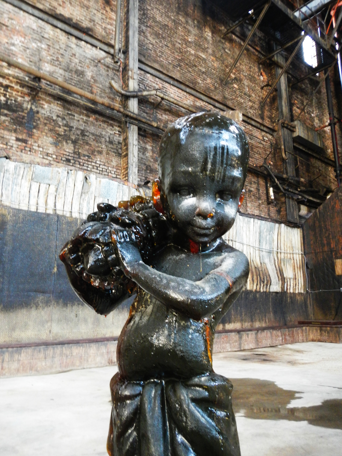 The smell of sugar as you enter the space is unmistakable and as your eyes adjust to focus on the looming bright white woman in the distance, suddenly the ghosts of children past merge out of the molasses. Beautiful little African boys laboring under overladen baskets or clusters of bananas appear to be melting before your eyes. Some are made of resin, others of sugar, and all somehow smiling, owning the space. The politics of enslavement interwoven with the sweetening appetite of the world are hauntingly presented in these replicas – the mould for which Kara bought on Amazon… in 2014….