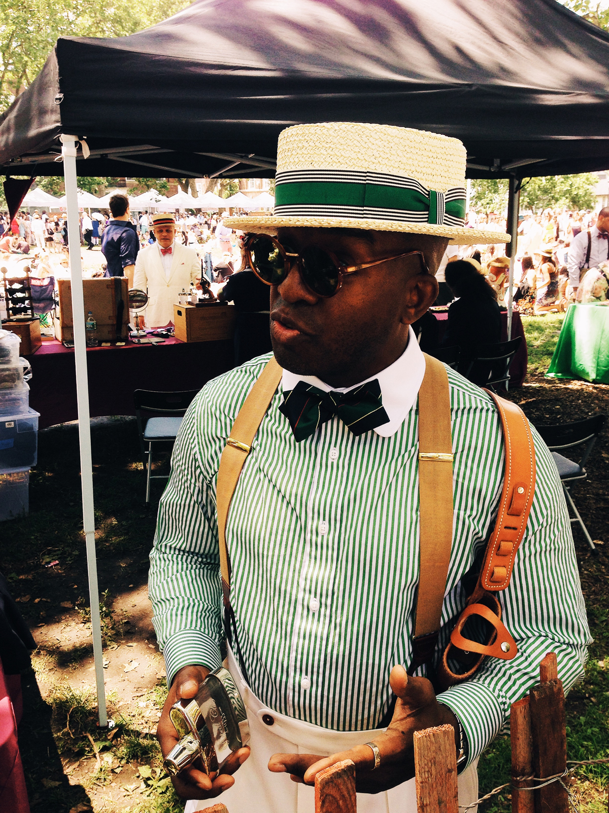 In any case the music won out. The costumes were better than ever this year, a tribute to the industry and authenticity of the merchants in residence. Corey Miller from Prohibition Clothing was not only an extremely dapper man, but his knowledge of the dark dry days was diabolic. In fact Corey’s parents live in a community in Ohio that only recently legalized the sale of alcohol – and that was only because they wanted the revenue that was being lost due to the locals pursuing proofed refreshments across the county line. It turns out Prohibition still reigns in 10% of the country today. But that did not include Governor’s Island on the weekend. Mr Miller strutted his handmade holster fitted with a superbly stylish flask, and there was no shortage of juleps or Jack Daniels to fill it. With the music and dancing in full swing I couldn’t resist a small purchase, a badge that announced ‘the happy days are here again!’