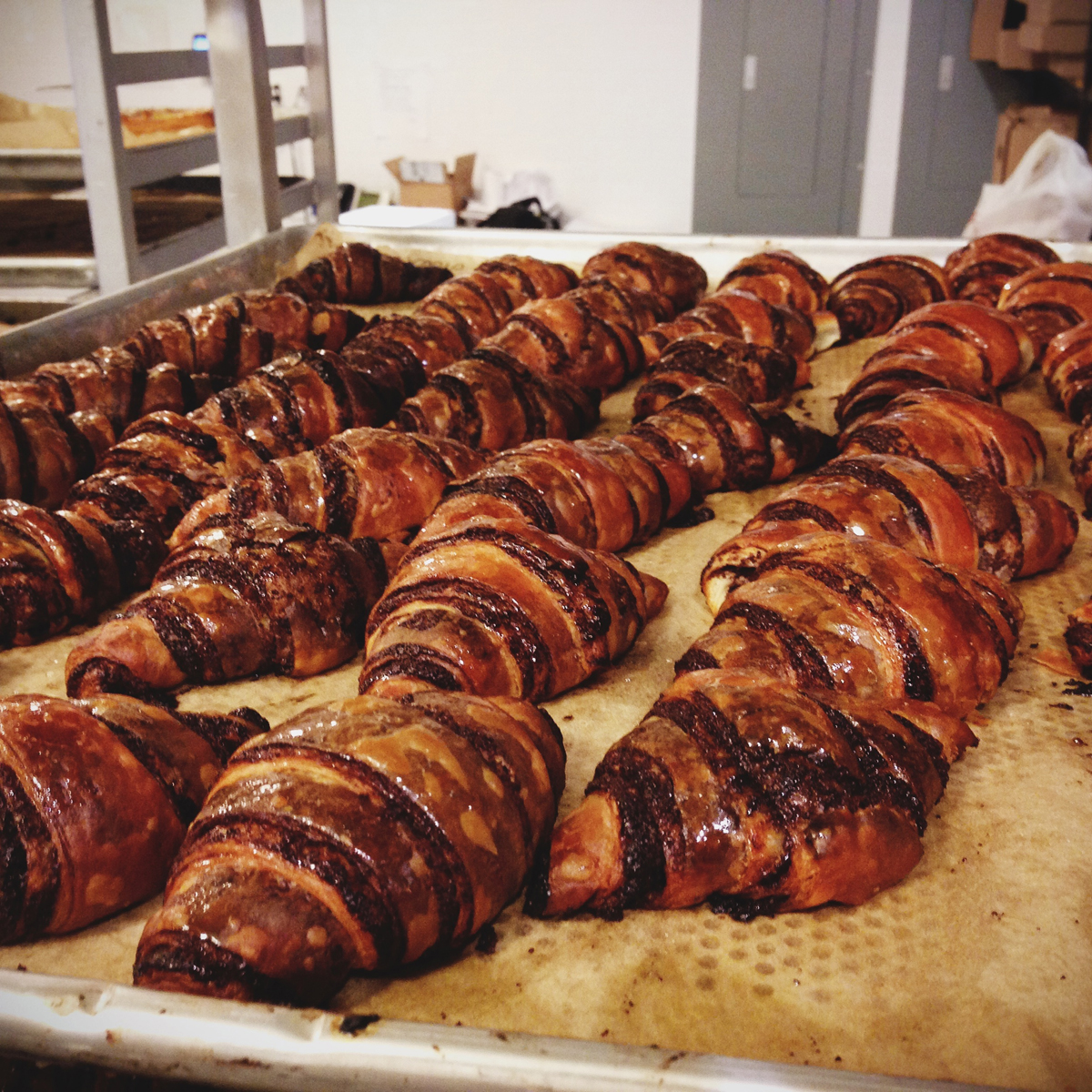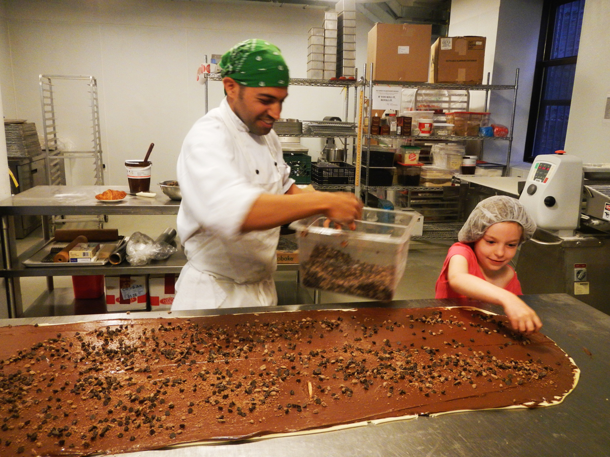The passion of Adir for his craft was as obvious as his skill. Thanks to Sharon the pastry was a perfect thickness, Adir then lacquered on the nutella with lightening precision and an enthusiastic young adherent assisted with the sprinkles. The discipline of the roll was all in the wrists, with repetition guiding the energy flow from muscular to the metaphysical. Plaiting was a blur of consciousness but weighing meant every piece would bake to perfection. When you are making 160 of these a day there is no time to waste, especially when there are also croissants, pretzels, foccacias and bountiful breads to oversee. But the whole process was all the more interesting because of the openness of the instructor. There were no secrets and while this is not something I would necessarily try at home, I can imagine having a new mantra if ever I get back to the mat. In the meanwhile, disciples of the chocolate babka can practice at Breads Bakery every day…
