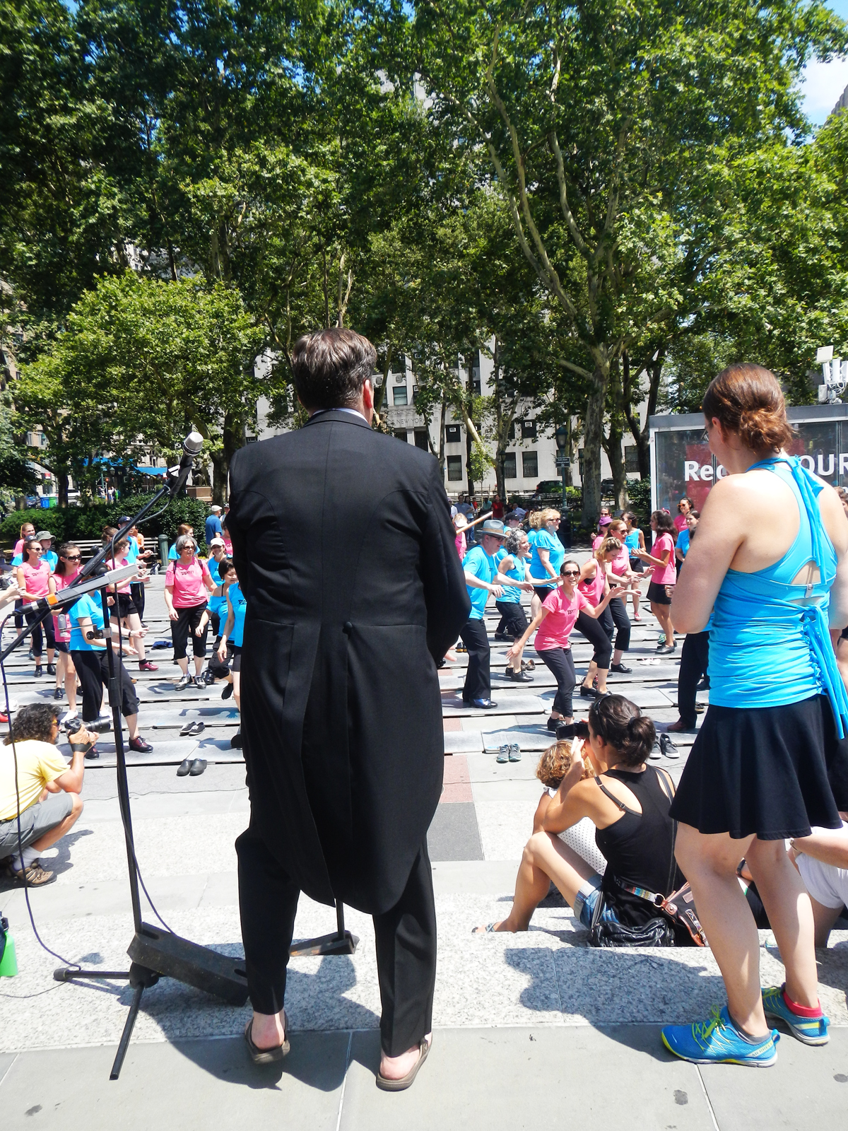 Tap City showed that you didn’t need two arms – or even tap shoes, to be part of the hoofers sharing rhythm in downtown Manhattan yesterday. Young people of all shapes and sizes clapped and stomped in a seemingly effortless display of coordination. The conductor, wearing tails and flip flops, and appropriately named Tony Waag, kept the pace lively but clearly had no problem with enthusiasm. Even in the dripping heat, the colorful crowd beamed energy from face to foot as the city elders looked on with approval. Tap dancing started on this very spot a couple of hundred years ago, when Irish and Africans and clog-wearing immigrants got in the groove to survive. The Snap, the Flap and the Shim Sham Shimmy were for many the beginning of their American dream.