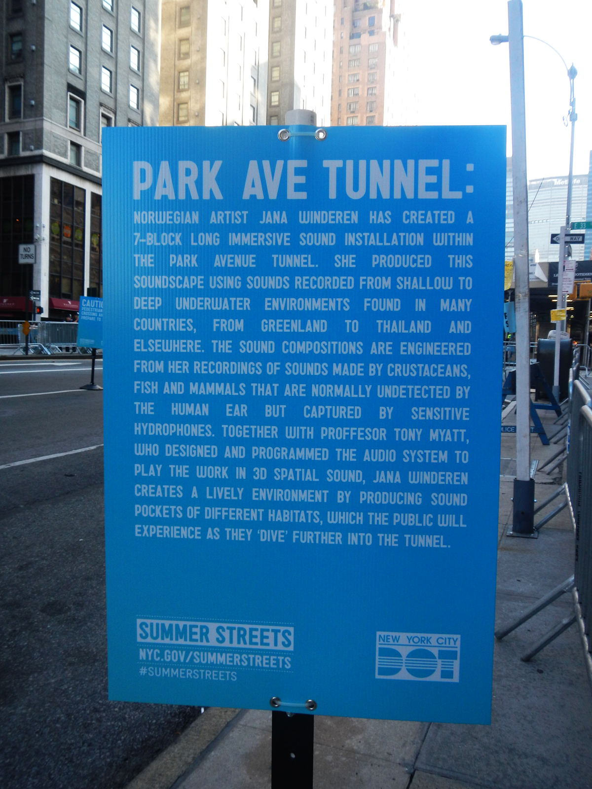 The closest I came to Coogee Beach this summer was the seven block tunnel underneath Park Avenue. While there was no white sand, waves, or even water, there was plenty of sound, and if you closed your eyes long enough and really used your imagination, you could almost smell the sea at Sleaford Bay or see your toes in the glorious emerald depths of Cable Beach. The underwater sound installation is part of the much anticipated Summer Streets program where for a precious few hours on Saturdays in August, Park Avenue is open only to cyclists, skaters and feet. This includes the tunnel, which with limited lighting, created ghostly shapes around pedestrians pausing to listen to the long moan of a whale or the curious cry of a crustacean. The Dive was created by Norwegian artist Jana Winderen, who not only brought previously unheard sounds to NYC, but has a recording contract for her oceanic choir.