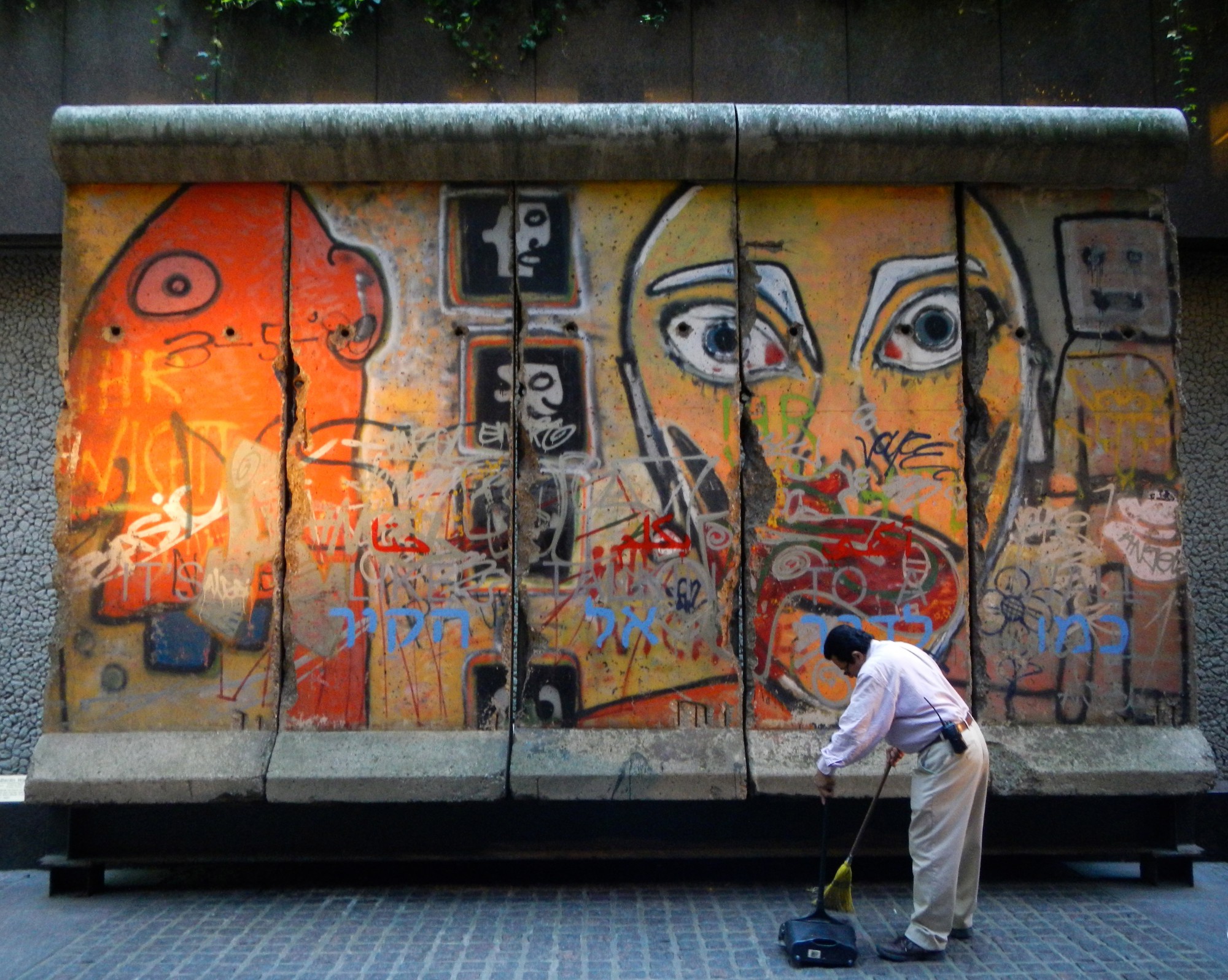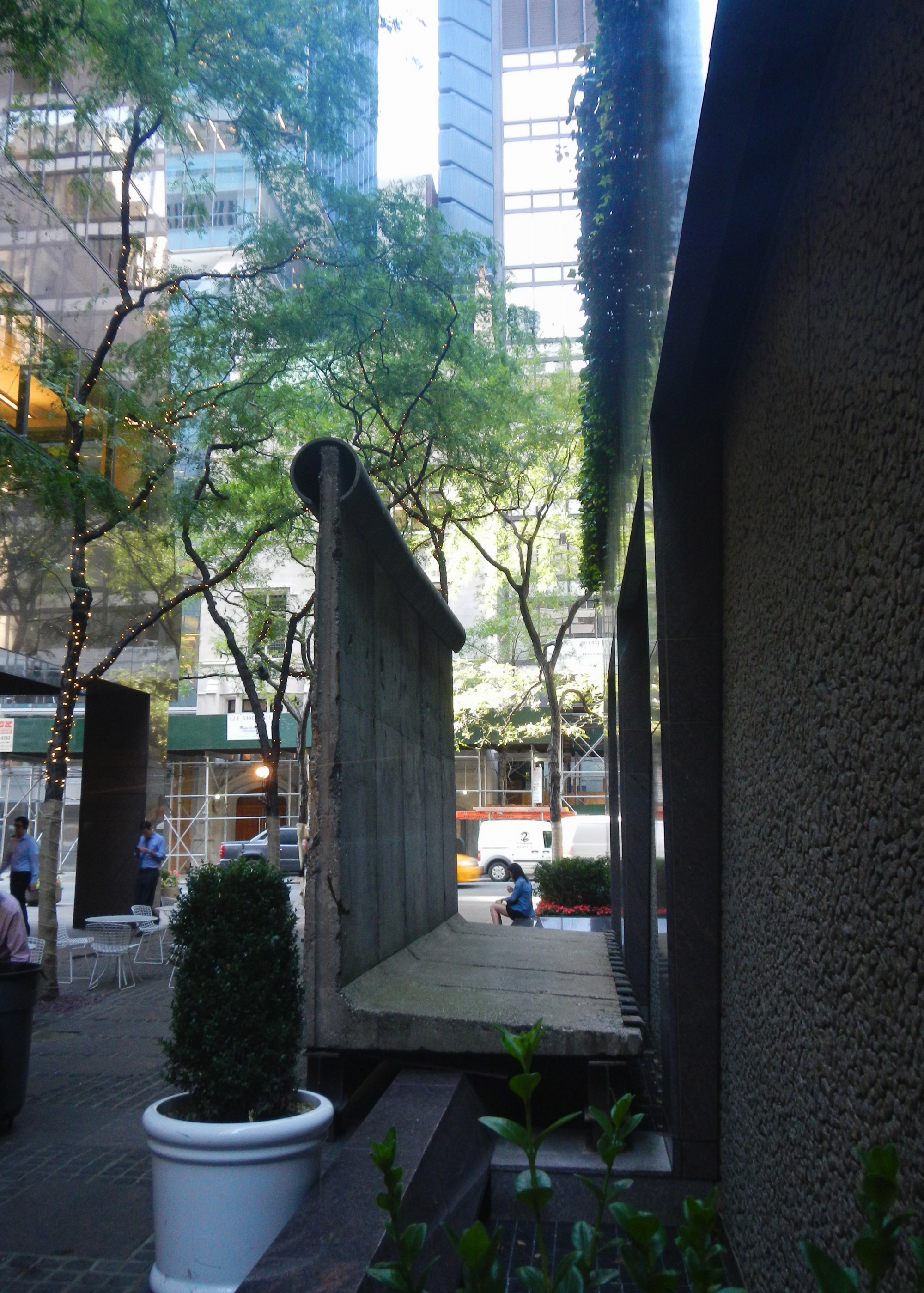 Five segments of the Berlin Wall are mounted in a public courtyard on East 53rd Street between Fifth and Madison. One side – what was the west side, is covered in graffiti and the other – the east side – is untouched. Like a work of art the wall is a backdrop to people having lunch or walking past with a coffee. A porter swept up around the wall this morning as someone has probably done since it was installed 24 years ago, but never did before that. He might have been shot if he tried. In 2014 Manhattan is not the only place in the world that boasts a segment of the wall – pieces can be found all over Europe, North & South America, Africa and Asia. But the good news is that there is plenty of room for the next wall that comes down. Let’s hope it is soon!